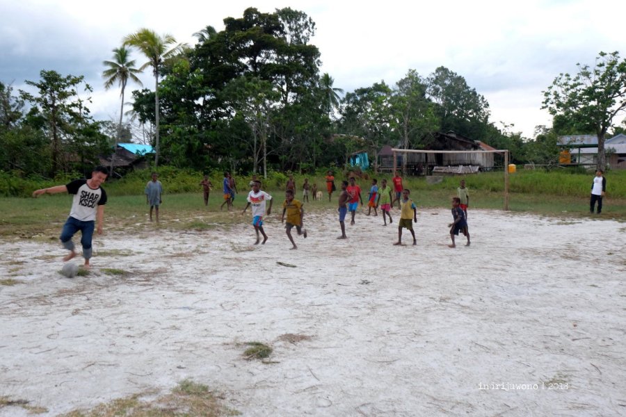 Dari lapangan kayu di depan kantor kepala distrik, kami menutup hari dengan segaris jingga di langit yang warnanya hangat jatuh pada kulit. Terik yang tadi sudah terlupakan dengan cahaya yang pelan-pelan bermain.