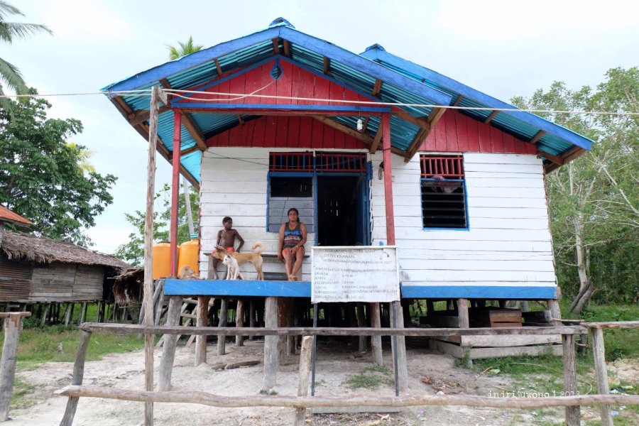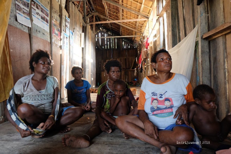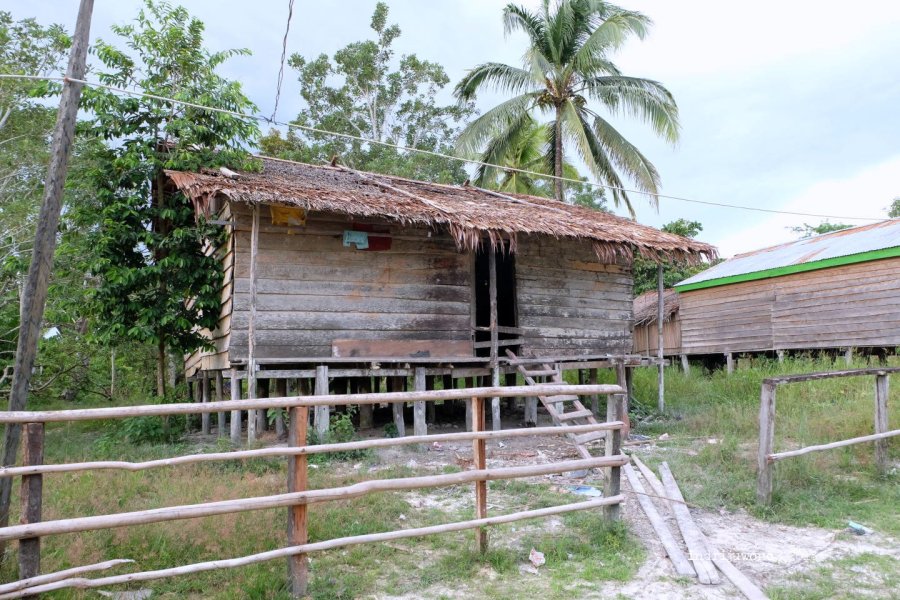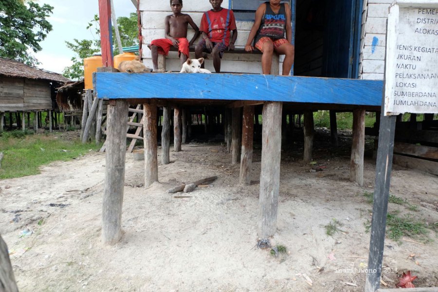 Beberapa rumah ada di tepi jalan, namun sebagian lagi jauh di belakang. “Apa bedanya, mama?” tanyaku pada mama Theresia yang menerimaku di rumahnya pada bagian ujung desa. “Yang di belakang itu rumah bujang, sedangkan di depan itu rumah dari pemerintah,” jelasnya. Yang ia sebut rumah bantuan pemerintah itu berdinding papan dan berjendela dengan atap seng, sementara rumah asli penduduk sana berdiri di bagian belakang dengan dinding dan atap pelepah daun sagu.