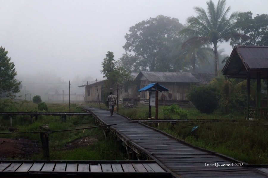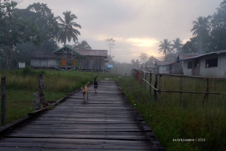 Aku melangkah pada jalan kayu yang melayang di atas tanah seperti pada titian, menghirup aroma pagi yang haru. Di sekumpulan sisi lain desa, anjing-anjing menggonggong membangunkan satu sama lain, seperti panggilan untuk memulai hari. Pagi yang setengah riuh dari Kolf Braza, sebelum matahari menggeliat dan pergerakan dimulai.