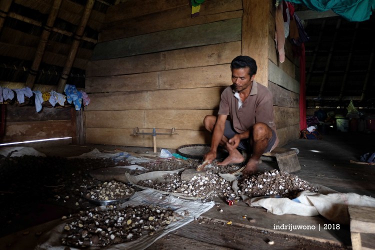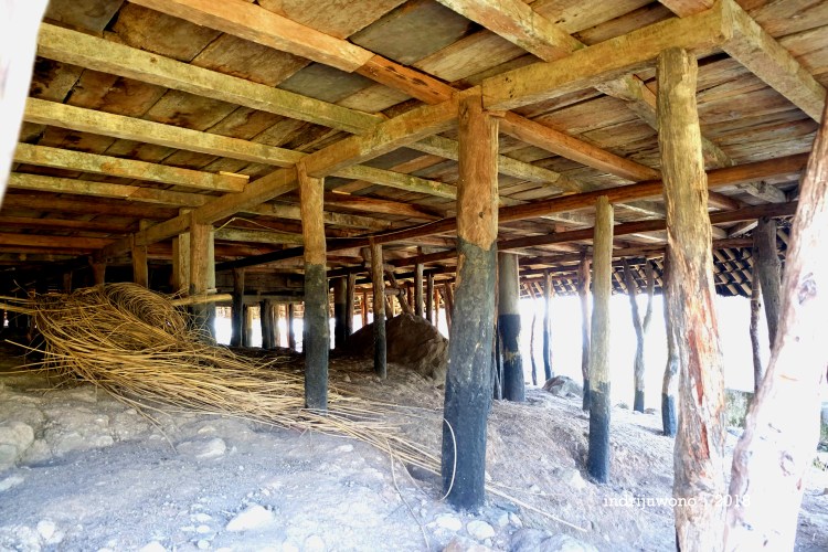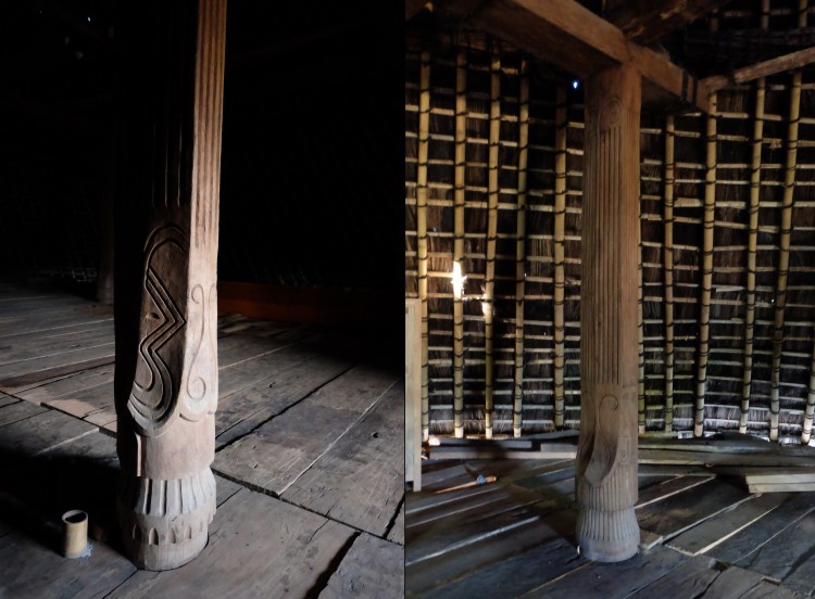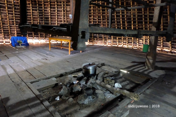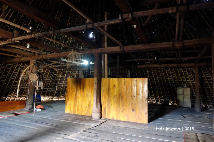 Keesokan harinya, aku kembali lagi ke situ karena belum berhasil masuk ke niang Wowang. Sebelum ibu-ibu penghuni niang ini ke kebun, mereka membukakan pintu sehingga kami bisa masuk dan melihat struktur di dalamnya. Pada bagian langit-langit area masuk, terdapat bilah-bilah papan yang penuh ukiran di balik naungan atap ijuk.
