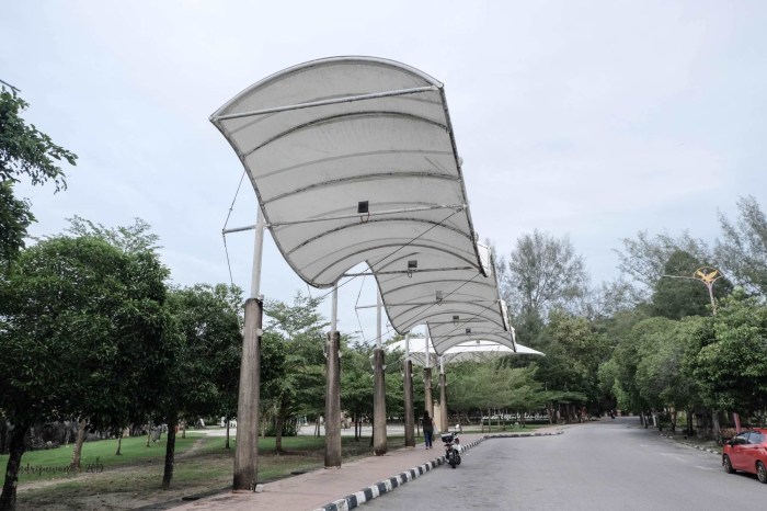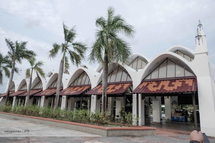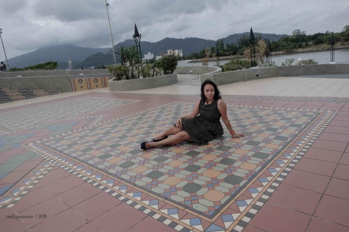 Nah, asyiknya di Langkawi ini transportasi umum dengan Grab mudah sekali digunakan. Jadinya nggak perlu selalu sewa mobil sepanjang hari, apalagi kalau kepingin keluarnya hanya sore hari saja. Dari A Rock Resort kami ke Dataran Lang. Tempat ini mungkin sebenarnya dimaksudkan sebagai lokasi melihat matahari terbenam. Gate masuk yang menarik dengan fasade lengkung bertemakan kerang menyambut kami. Sayangnya walaupun arsitekturnya bagus, namun tidak banyak berfungsi, hanya tukang souvenir saja yang berjualan pada hall yang besar ini. Mungkin tempat ini hanya ramai jika ada festival saja.