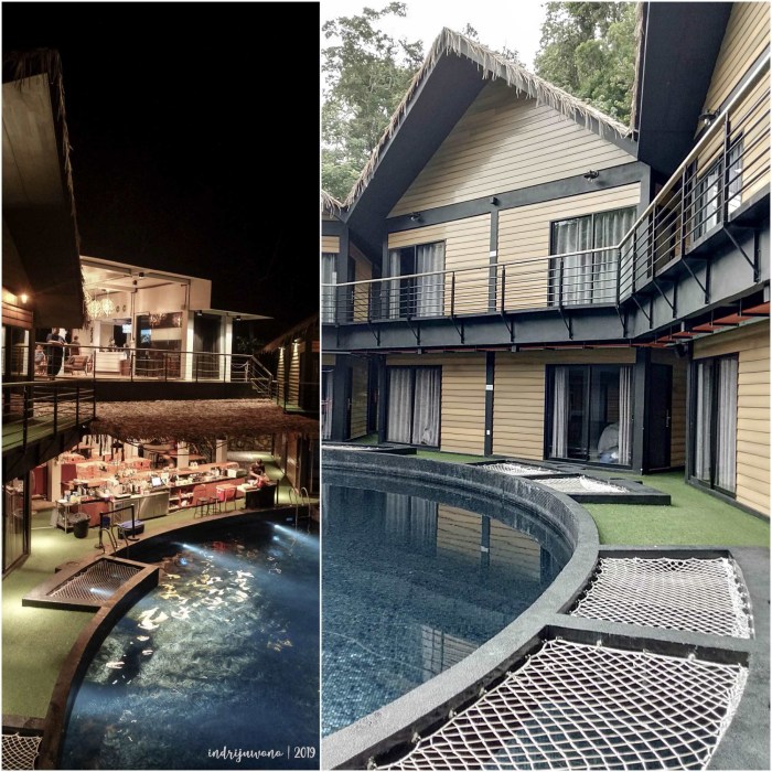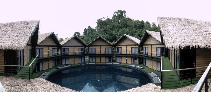 Hotel tempat kami tinggal bernama A Rock Resort Langkawi, dipilih karena keunikannya karena bentuknya yang berputar 360 derajat. Selain itu terdapat kolam renang di tengah-tengah sehingga pemandangan bukaan pun terasa lega. Dengan struktur baja dan beton (ya Allah, anak arsitek harus banget ngebahas bangunan), dan dinding-dinding semacam conwood, jendela-jendela yang besar membuat ruangan di dalamnya terasa lega. Kami pun beristirahat hingga tiba saatnya makan malam dan memesan di restoran di depan kolam renang yang menunya western.