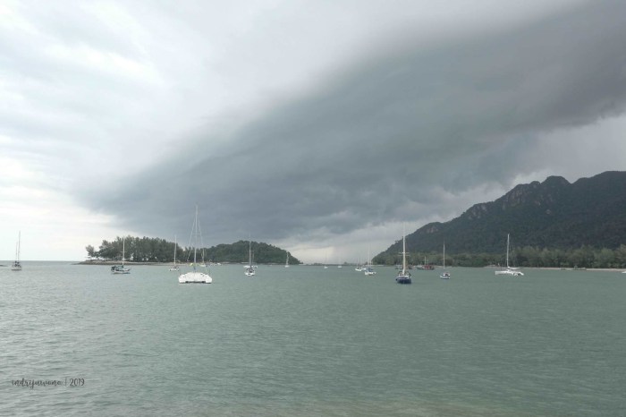 Benar saja hujan turun dengan lebatnya dalam perjalanan kami di tepi laut menuju Pantai Chenang. Sempat berputar untuk mencari ATM (pokoknya punya rekening CIMB untuk keliling Asia Tenggara itu cukup enak, karena nggak ada withdrawal fee – bukan iklan ini), akhirnya nemu di pompa bensin, yang bisa sambil sekalian mencari kudapan.