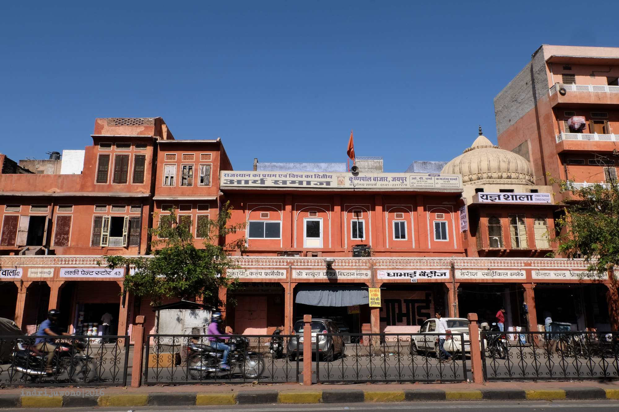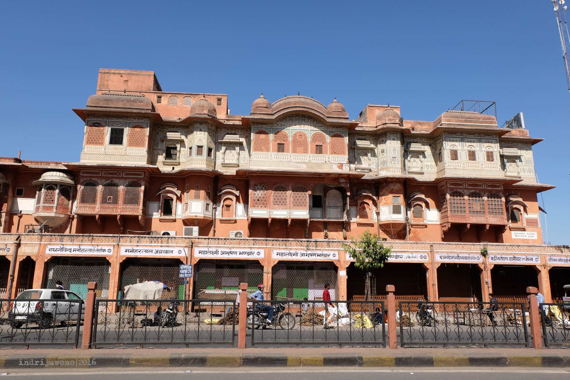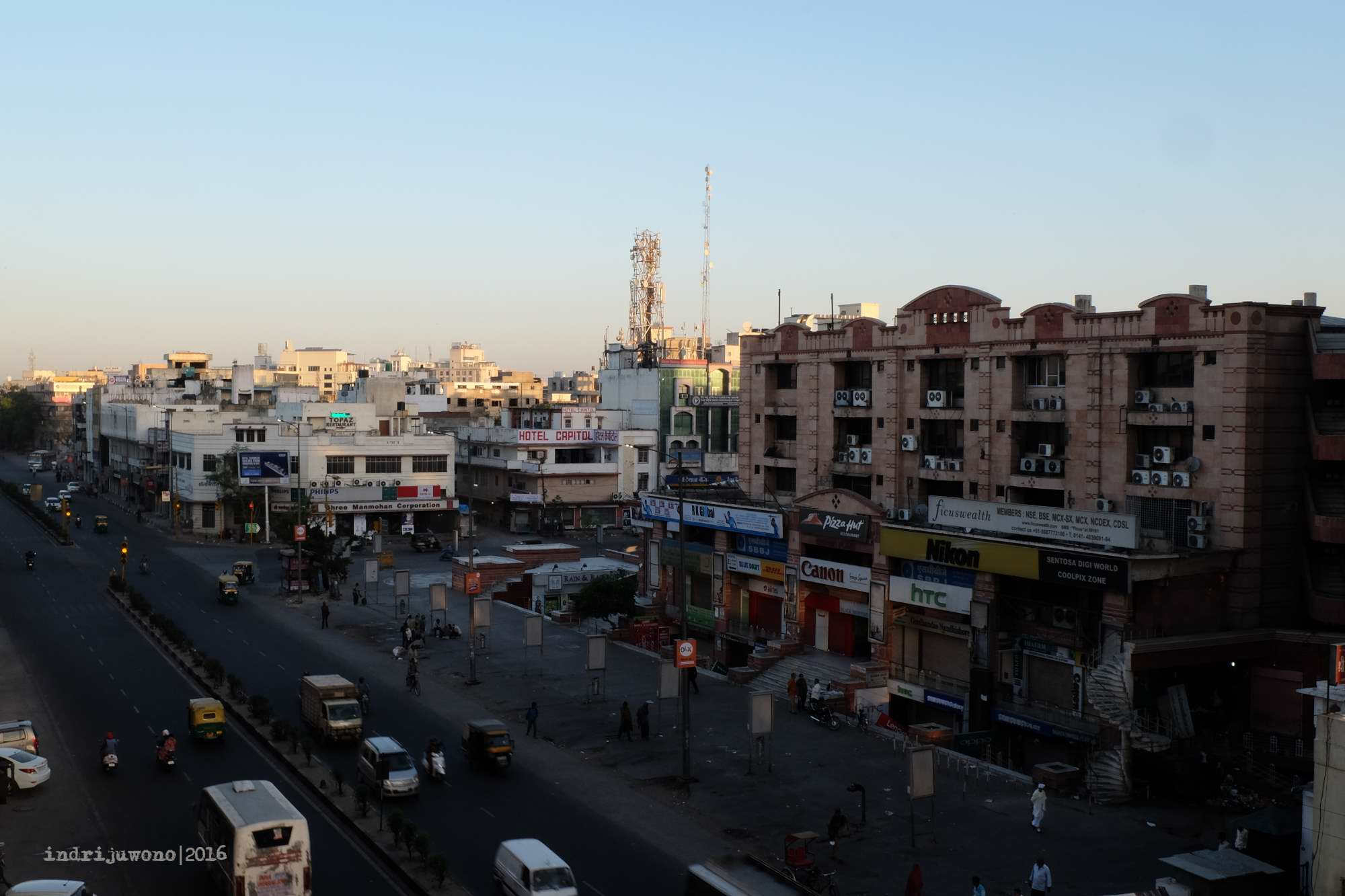 Karena hostel tempat menginap tidak terlalu jauh dari stasiun Jaipur, kami memutuskan untuk berjalan kaki saja. Tapi begitu sampai memang rasanya kepingin leyeh-leyeh dan ngadem di AC, ketimbang mulai melihat-lihat kota. Jadi, ketika senja menjelang barulah kami mulai jalan kaki menyusuri kota dan menikmati sore di tengah kota Jaipur. Rupanya kota ini penuh dengan bangunan gaya British Colonial yang masih digunakan baik sebagai bangunan pemerintahan, maupun pertokoan. Usai mengudap Masala Dosa dan Chicken Tikka, aku memilih beristirahat saja dan mencari tahu hal-hal yang bisa dieksplor esok harinya. Yang membuat tertarik mengunjungi kota ini dalam salah satu itinerary adalah kota lamanya yang terlihat eksotis, sebagai salah satu pintu masuk daerah Rajasthan dari arah timur, banyak obyek arsitektur klasik India yang masih bertahan di kota ini.