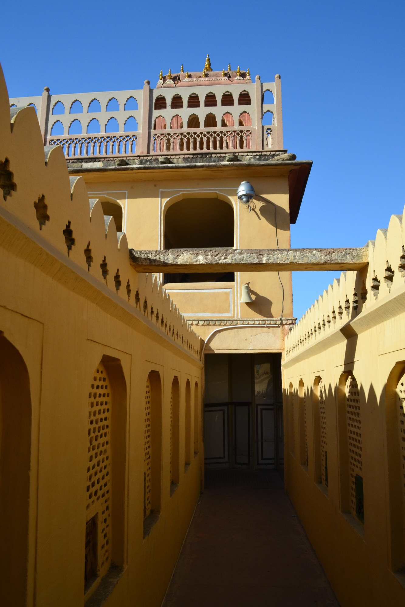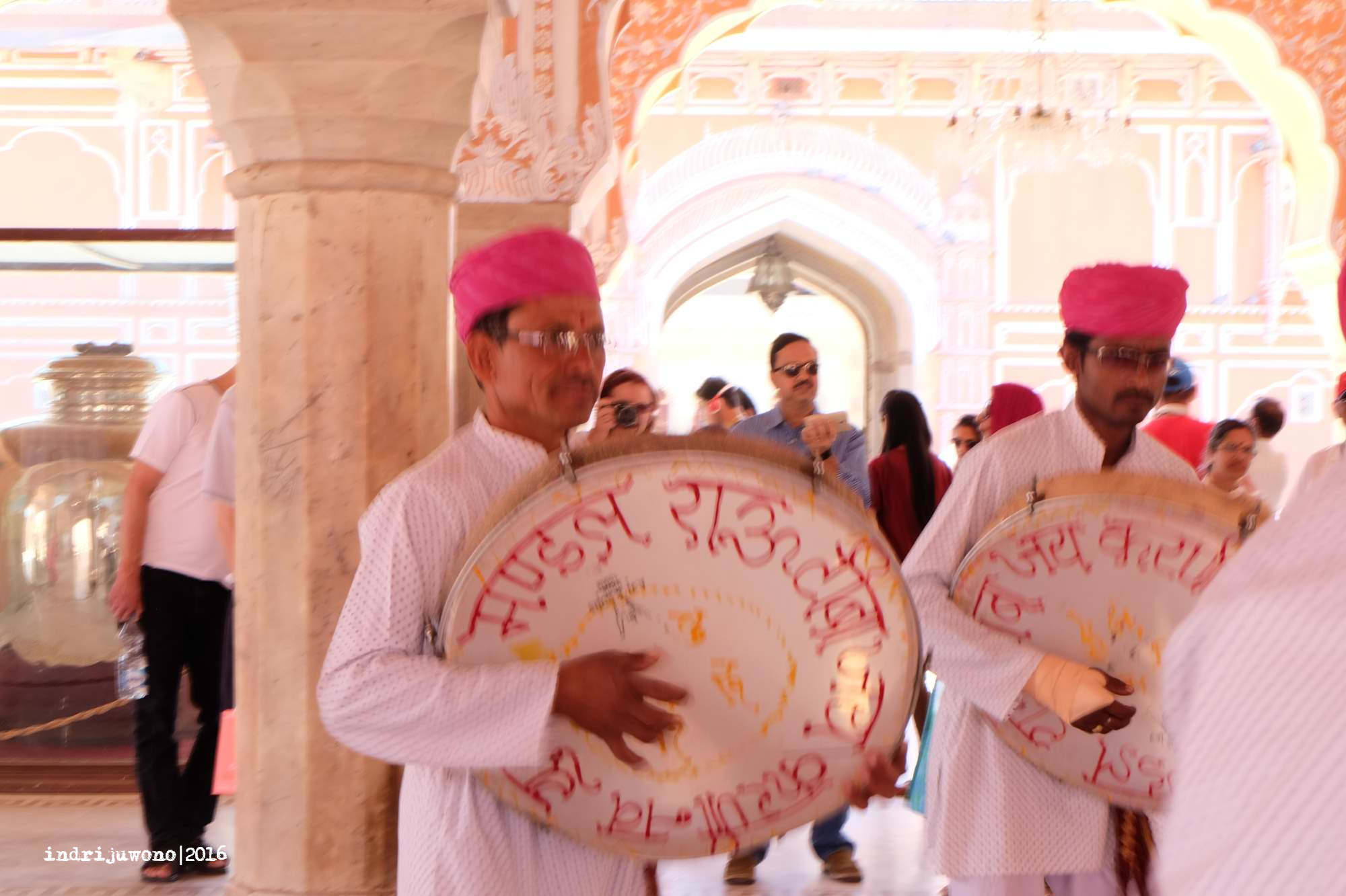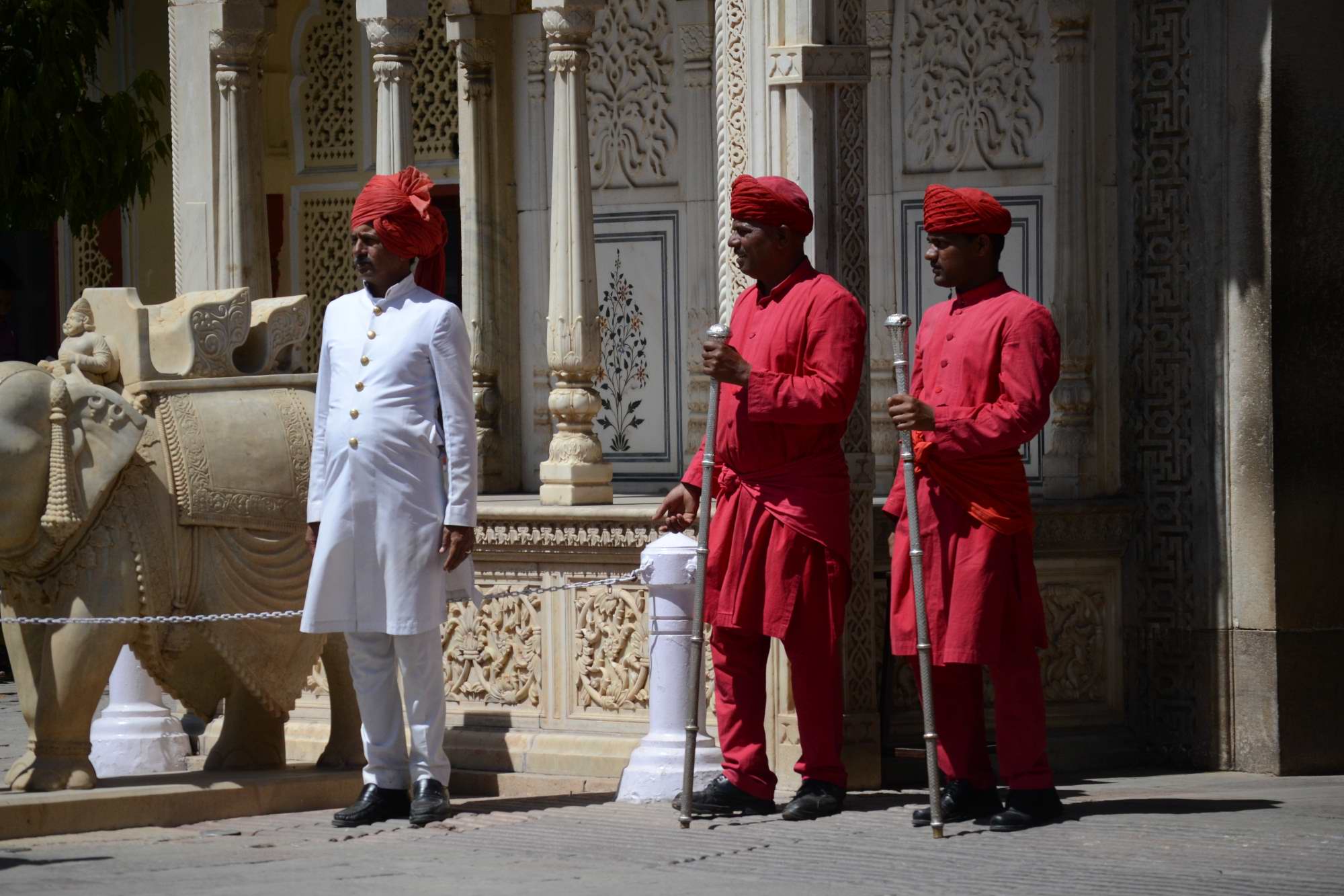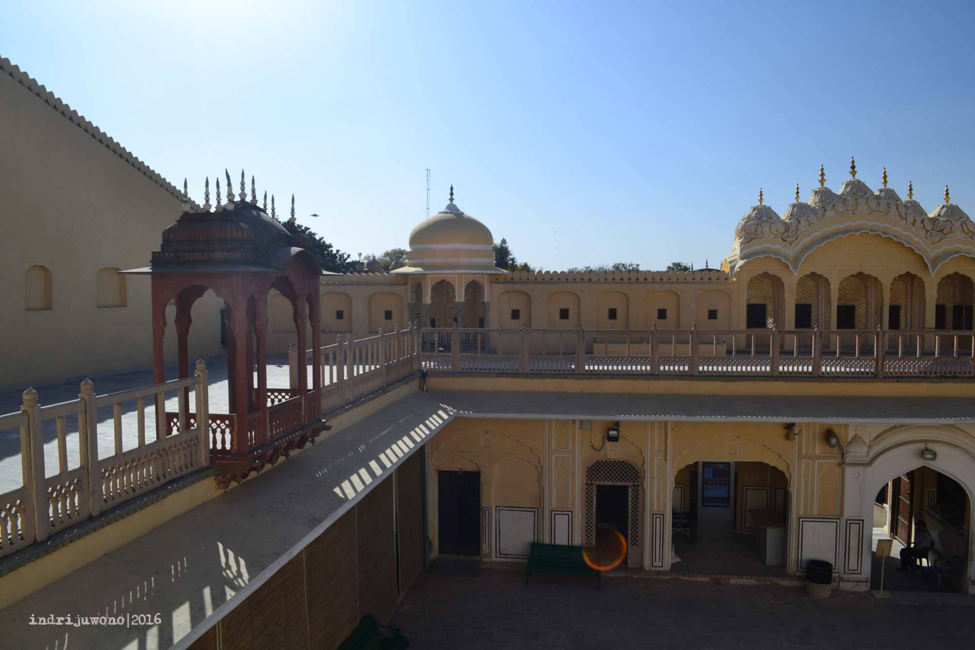 Baru dari sini aku bertemu dengan gerbang yang dijaga oleh tiga orang berseragam merah yang khas Rajashtan, namun sayangnya kalau mau berfoto dengan beliau harus mengeluarkan uang lagi. Jadi hanya sekadar mengamati gerak gerik mereka kemudian aku lewat gerbang untuk masuk ke courtyard berikutnya.
