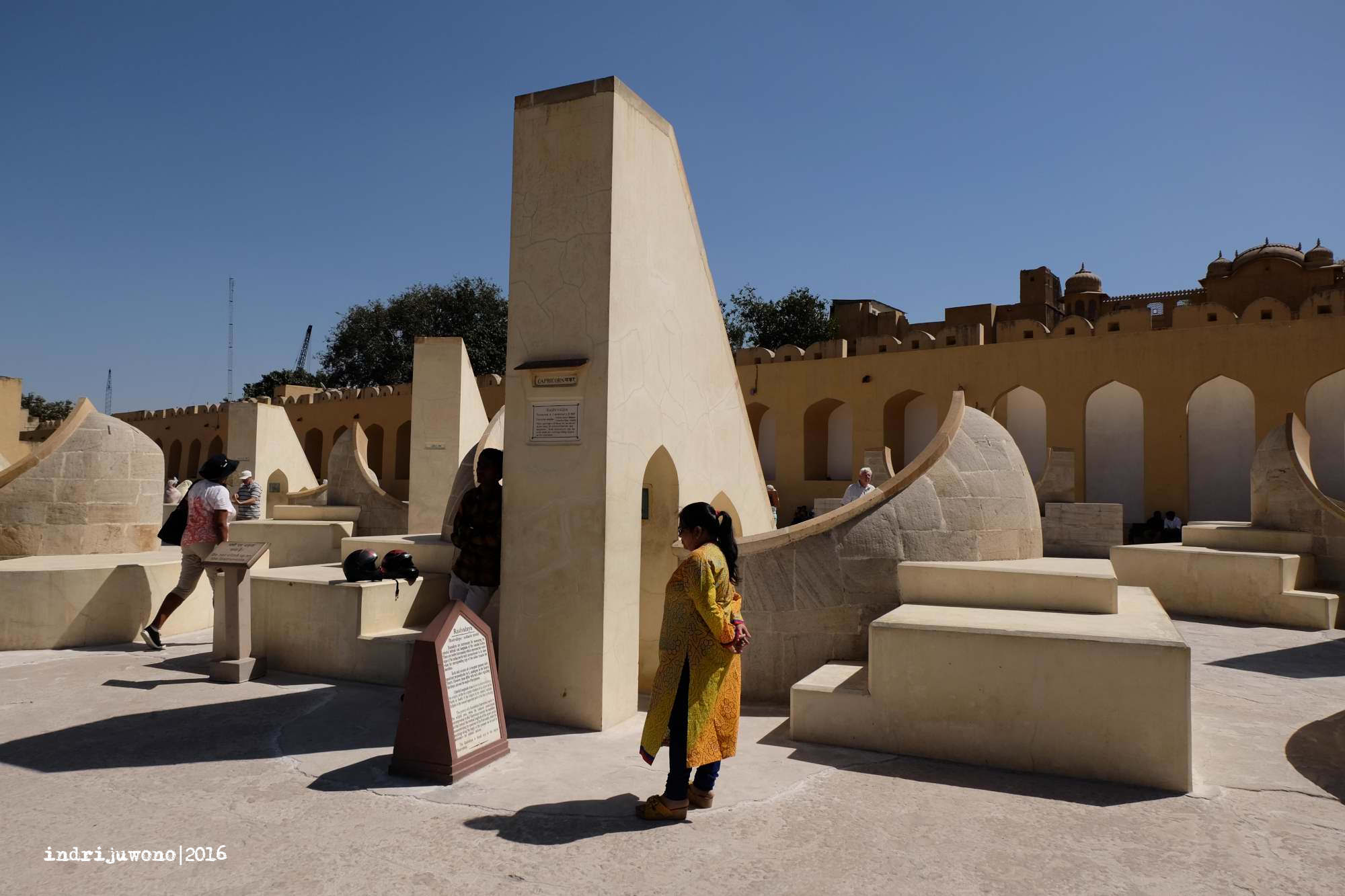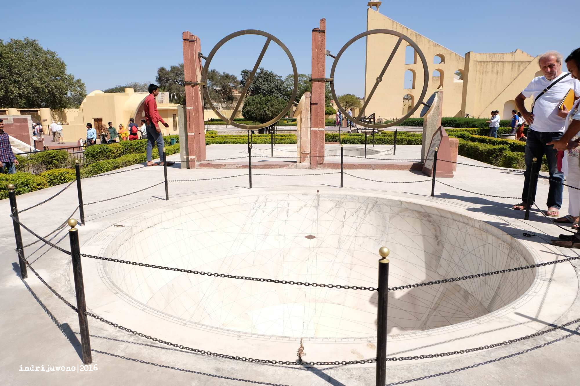 Tepat di seberang pintu masuk City Palace , adalah Jantar Mantar. Rekomendasi dari penjaga hostel yang membawa kami ke observatorium kuno terbesar di Asia ini. Aneka pembaca pengukur benda-benda langit dengan ukuran besar yang sudah dibangun sejak tahun 1724 dengan konstruksi batu yang berulang kali direkonstruksi. Dahulu tempat ini dibangun untuk memprediksi waktu dan pergerakan matahari, bulan dan planet oleh Maharaja Jai Singh II yang memang tertarik dengan astronomi.