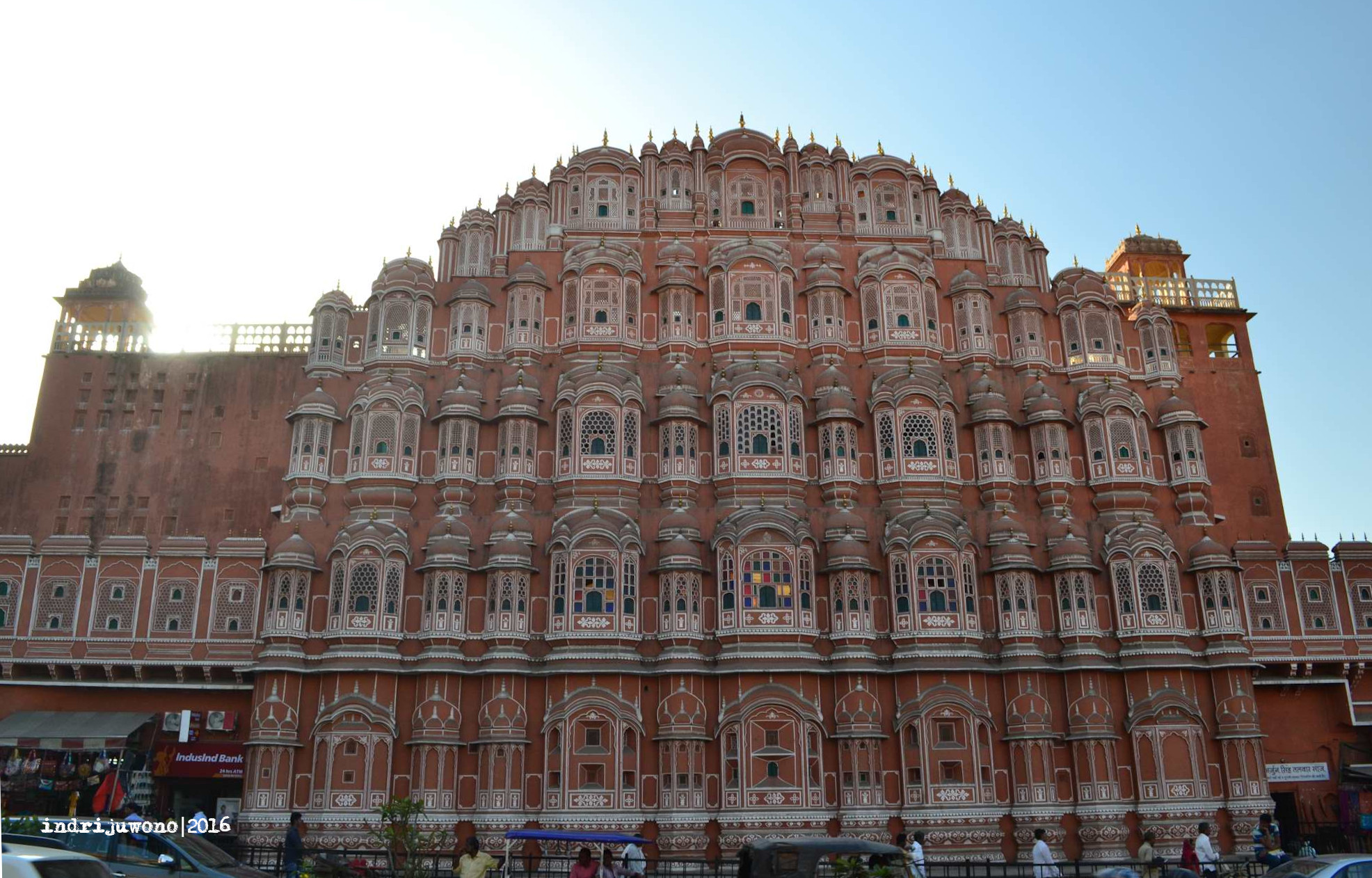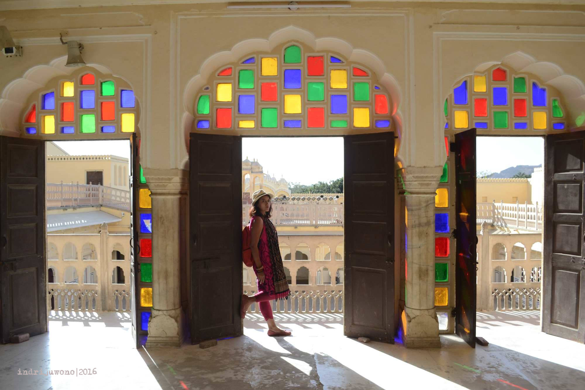Matahari sudah makin terik di kepala ketika kami melanjutkan perjalanan ke bangunan yang paling diburu orang karena keindahannya tersebut. Masuk dari belakang,kami menemukan area mulai dari lantai dasar berupa courtyard lagi dan tangga-tangga simetris yang bisa dinaiki hingga atas. Bangunan iini didesain oleh Lal Chand Ustad pada tahun 1799. Yang khas dari Hawa Mahal adalah eksterior lima lantainya mirip dengan sarang lebah dengan 953 jendela kecilnya yang disebut Jharokhas dihiasi dengan kisi-kisi dengan kaca patri warna warni. Efek kaca ini dari dalam membuat bayangan berwarna warni juga di lantai.