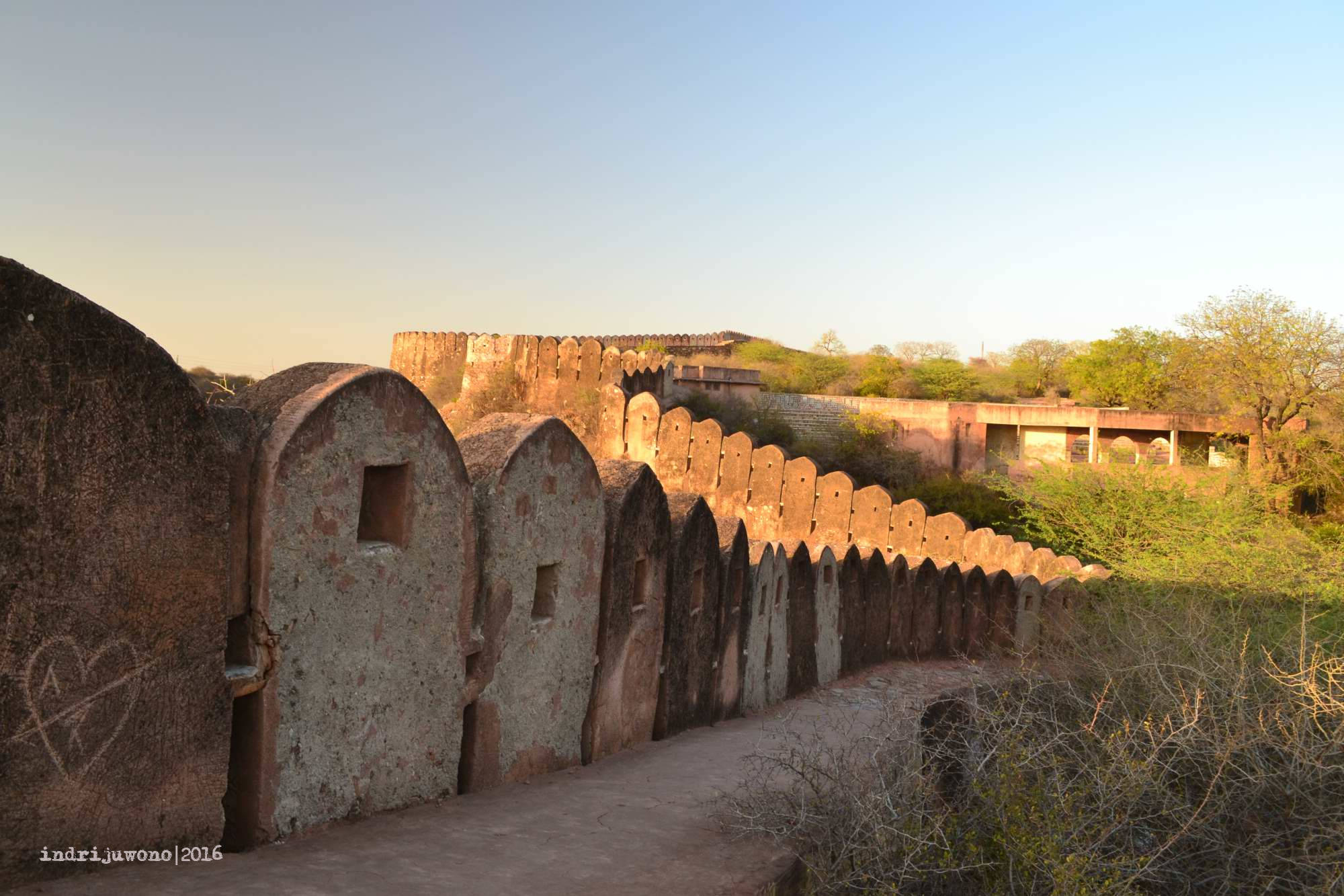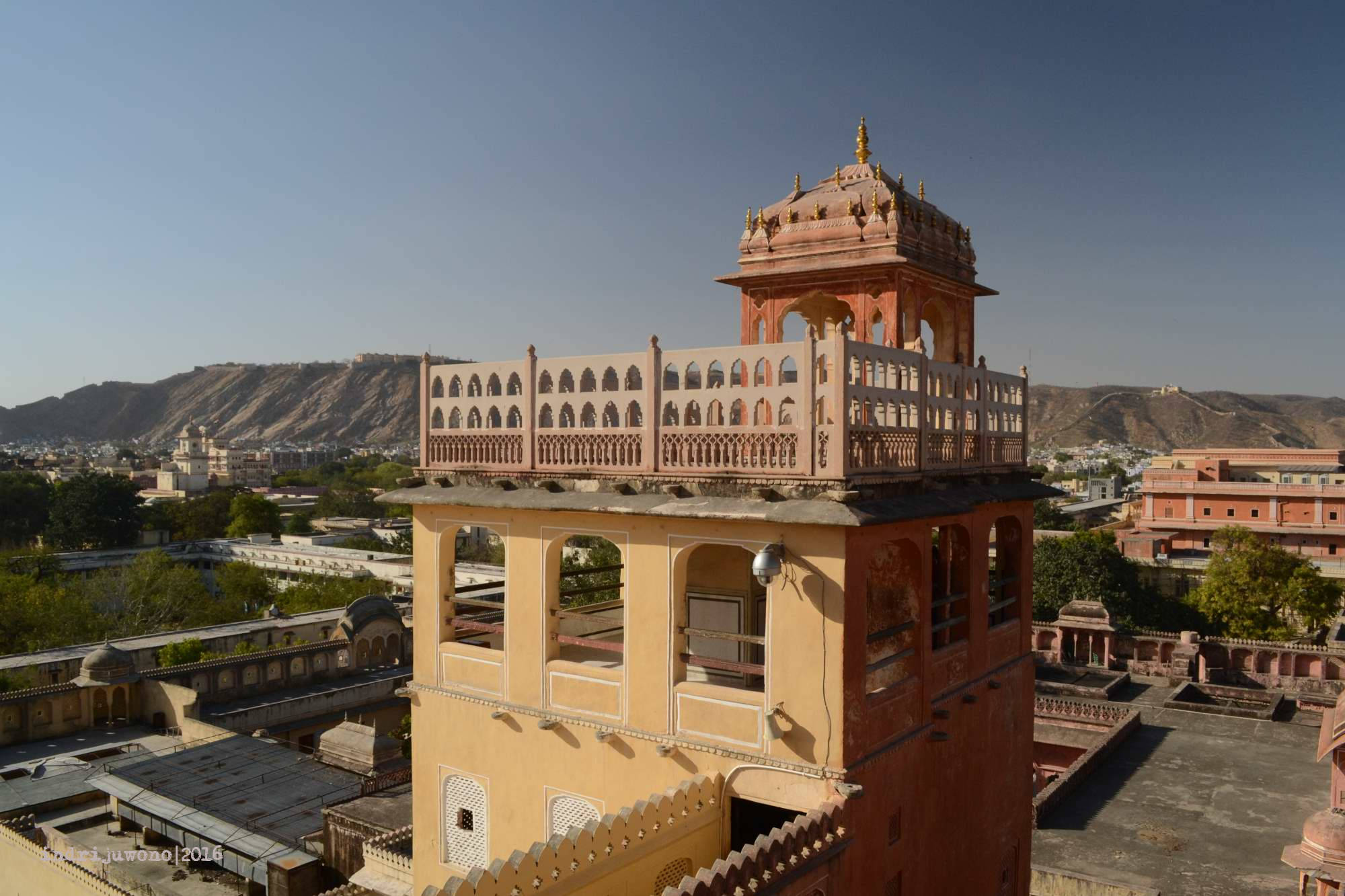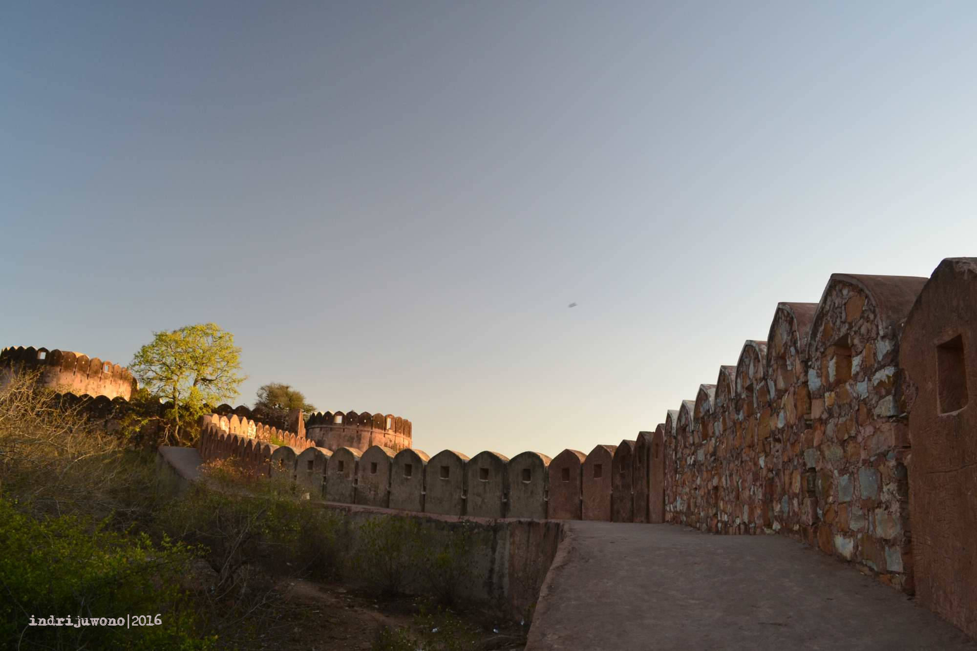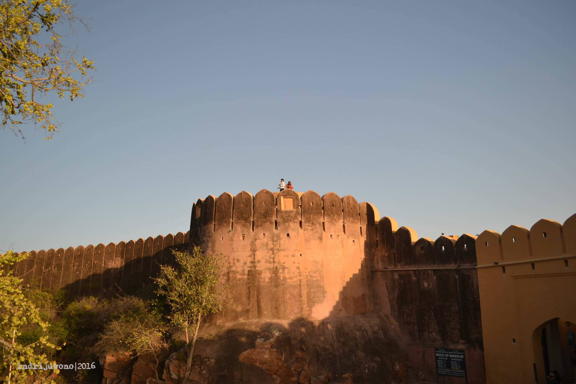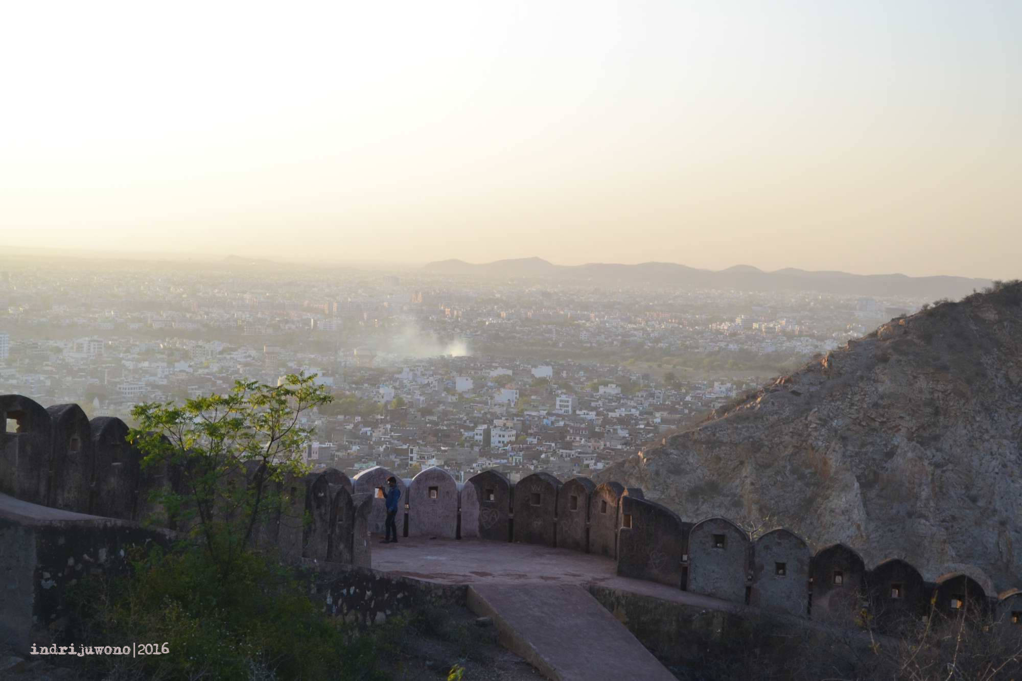 Walaupun kelihatannya di luar masih terang, tapi jam 6 sore di Jaipur memang sudah waktunya berhenti aktivitas. Tanggung sudah sampai di atas, aku memutuskan untuk berjalan-jalan di sekitar banteng terluarnya, yang memang dari situ bisa memandang keseluruhan kota Jaipur. Bahkan kota lama pink city bisa terkelompokkan dan ujung Samrat yantra di Jantar Mantar terlihat jelas dari sini. Lucunya, aku bertemu dengan beberapa orang dari hostel yang sama juga berkunjung ke sini.