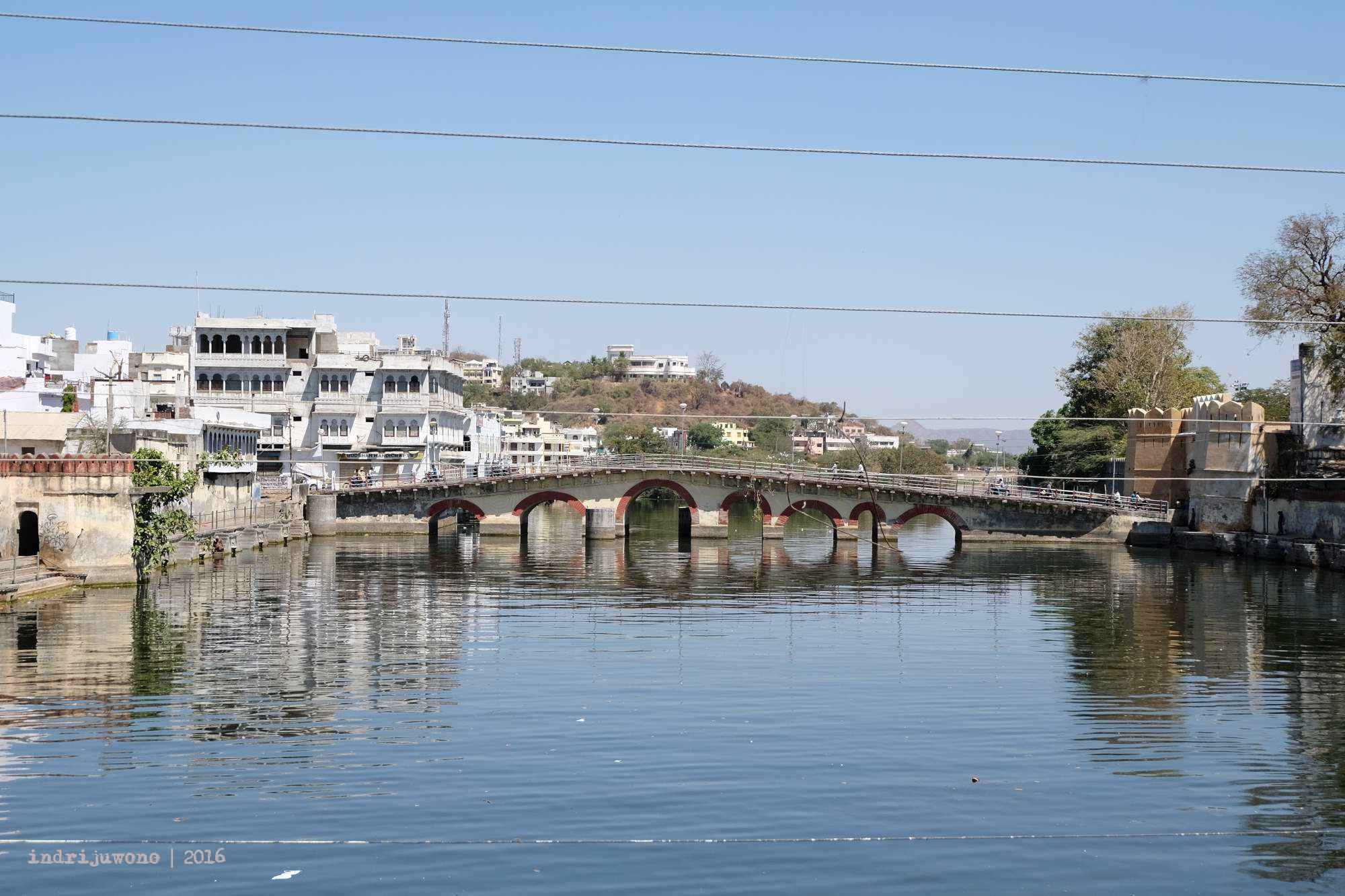 Sepeninggal dari museum ini, kami menuju jembatan yang menyeberangi danau Pichola untuk melihat kota dari seberang. Kebanyakan di tengah sini digunakan sebagai restoran, namun tak sedikit yang duduk-duduk di tepiannya. Yang menyenangkan dari Udaipur adalah kota ini cukup bersih, dan tidak banyak pengemis dan peminta-minta seperti kota lainnya sehingga turis bisa menikmati lokasi-lokasi ini dengan santai dan nyaman. Kalau punya waktu lebih lama lagi, nyaman sekali menulis di sini sembari diterpa semilir angin danau.