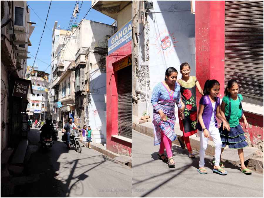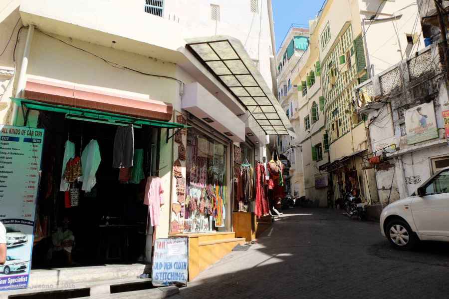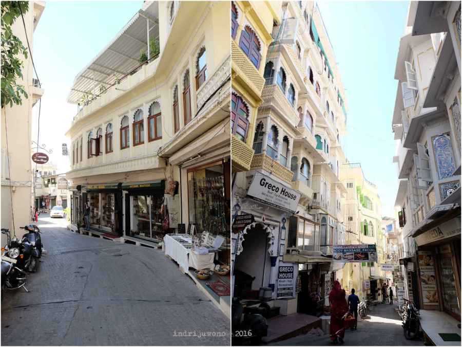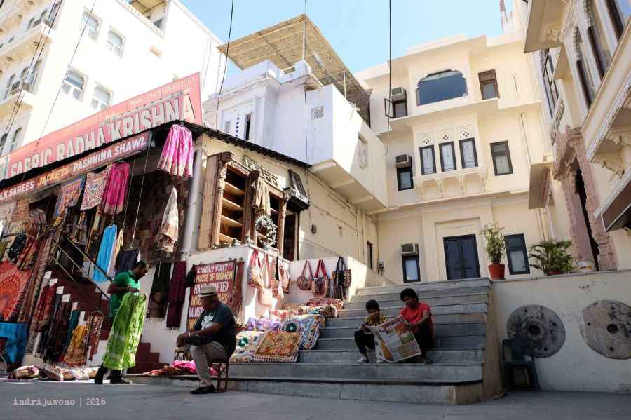 Lorong-lorong Udaipur sangat menarik dan hidup. Berbagai toko-toko yang menjual cinderamata berhias daengan berbagai ukiran yang cantik. Suasananya mengingatkanku pada lorong-lorong di Kuta, Bali, namun dalam skala yang lebih sepi. Kaca patri, balkon berpagar, ambang pintu penuh ukiran organik khas India memenuhi berbagai sudut kota. Aku pun sempat mampir ke salah satu toko buku dan menemukan satu karya Arundhati Roy di situ.