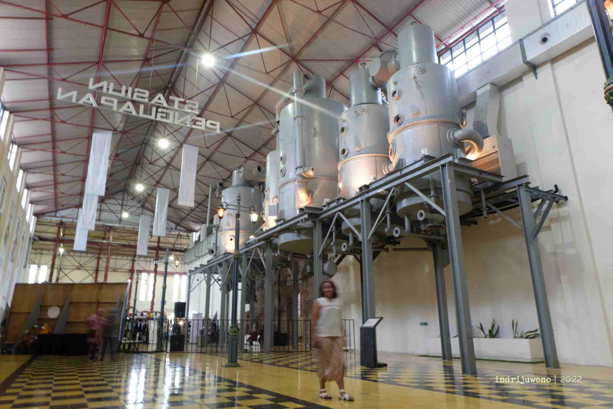 Ruang besar selanjutnya adalah stasiun penguapan. Konon ini adalah tempat menguapkan hasil jus bersih ini sehingga kadar H2O berkurang, menjadi sirup yang kemudian dipanaskan menjadi kristal yang akan melalui mesin putar menjadi bulir-bulir gula. Kondisi tabung-tabung tempat proses gula yang tadinya sudah jelek berkarat ini, sekarang cantik kinclong apalagi dengan ubin papan catur sehingga area tetap bersih.