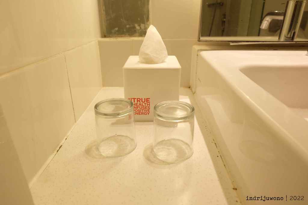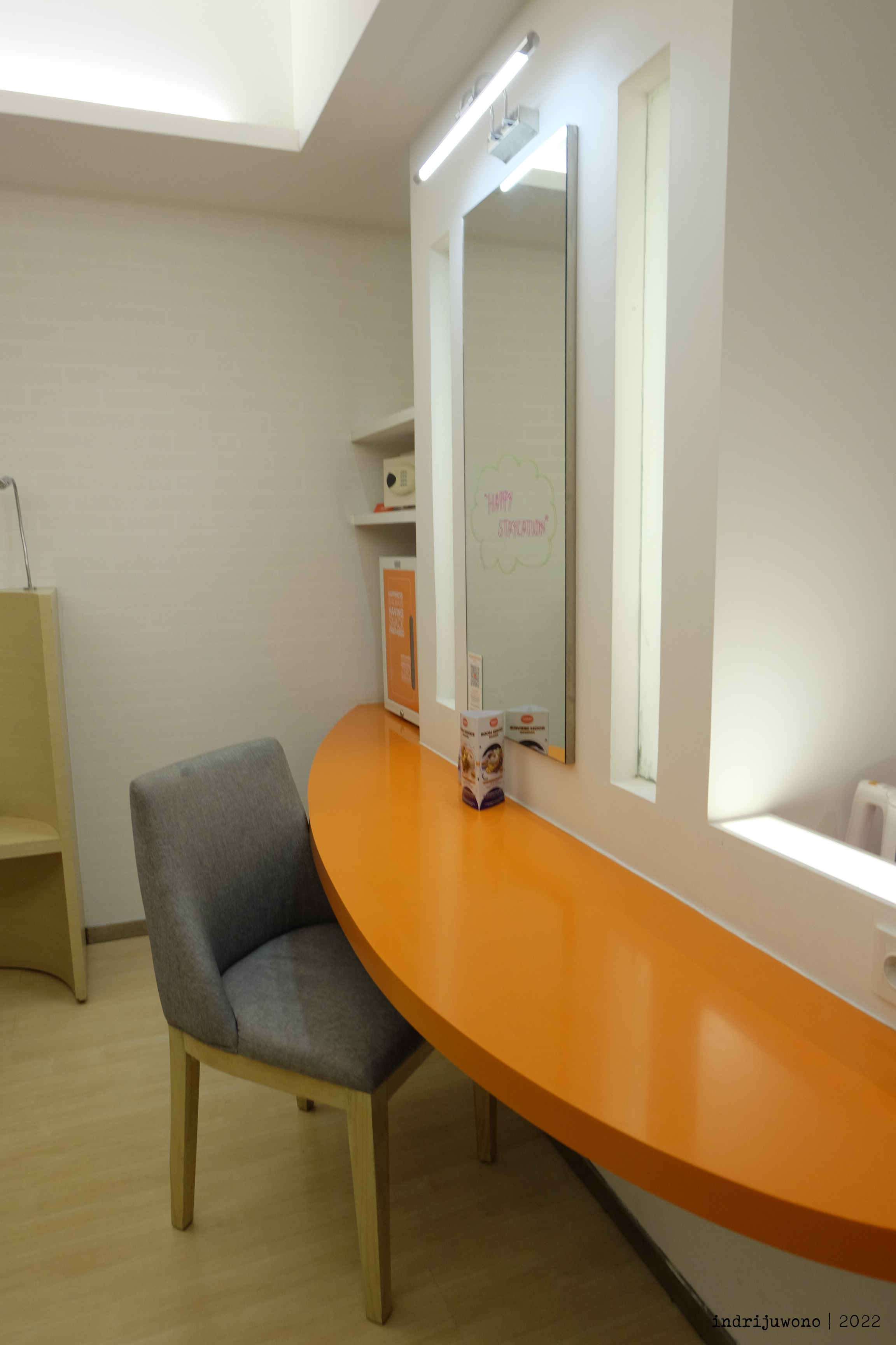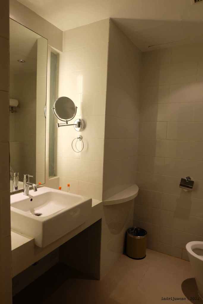 Kamar deluxe kami cukup menyenangkan, dengan satu tempat tidur queen di tengah, dan meja kerja yang menempel pada dinding kamar mandi, dilengkapi dengan kaca besar. Tentunya, daybed sofa di bawah televisi membuat kami tak perlu lagi pesan extrabed. Kamar mandi dengan nuansa putih memberi kesan bersih dengan semburat oranye di sana sini.