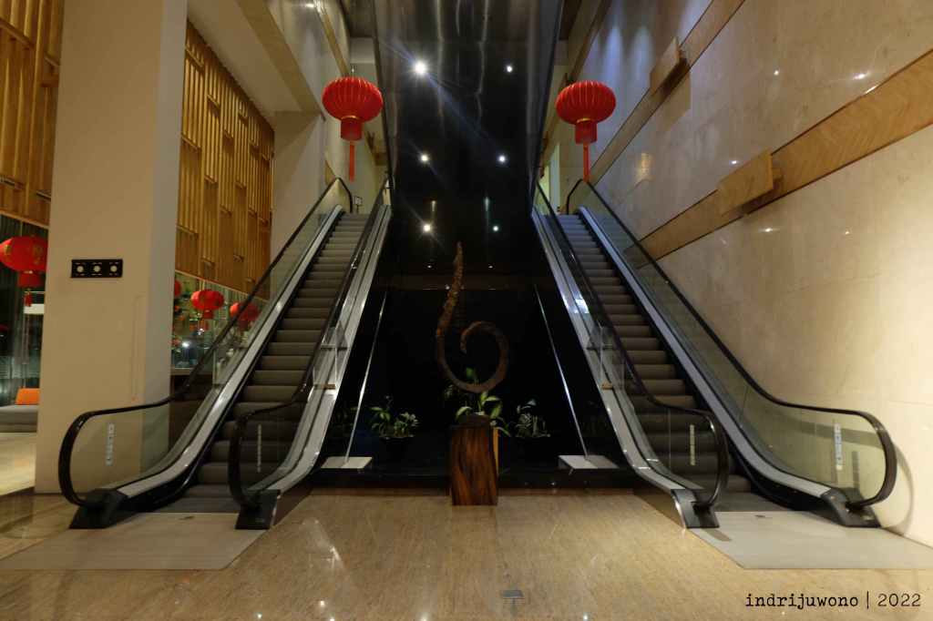 Kami tiba di Harris Hotel Gubeng sekitar jam delapan malam sesudah perjalanan dari Solo. Karena awal tahun waktu itu, jadi seluruh lobbynya berhiaskan lampion-lampion merah menjelang imlek. Just as aku ingat yang kukerjakan tujuh tahun yang lalu itu, lobby dengan langit-langit yang tinggi, dengan façade kaca tempered spider fitting.Tentu saja, nuansa jingga cerah masih dominan di sini. Ada penghubung ke hotel  POP! yang menempel tepat di sebelahnya.