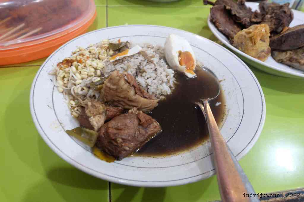 Ini juga makanan warna gelap namun citarasa luar biasa. Kuah kaldu dengan tetelan daging sapi dengan petis udang, disiramkan di atas kikil sapi, tahu goreng, perkedel singkong, taoge segar, selada air segar, mi kuning, dan terkadang dilengkapi krupuk kecil. Di beberapa tempat ini hanya buka pada malam hari. Memang, kunci rasanya pada kelezatan petis udangnya yang biasanya menjadi rahasia dari masing-masing penjualnya. Tahu campur yang kami jajal di Jl Jemur, dengan porsi yang melimpah ruah (dibanding Jakarta punya).