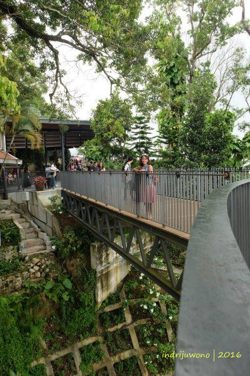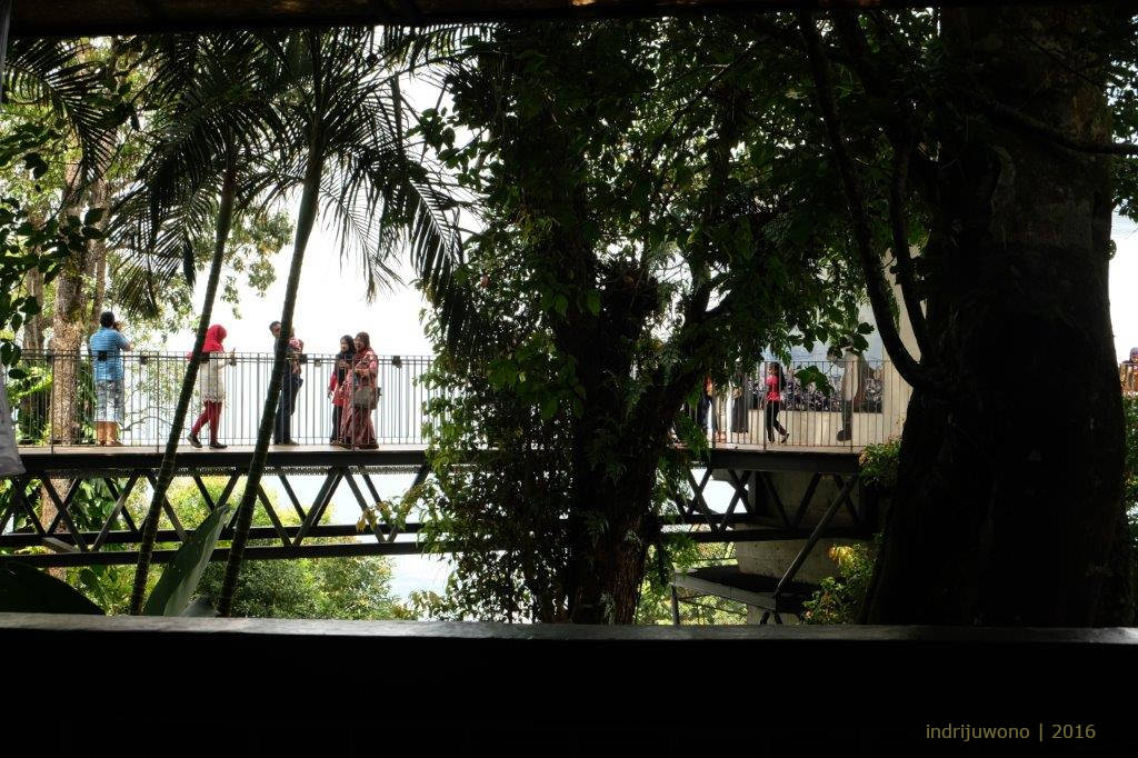 Tidak terlalu banyak bangunan di sini, hanya ada satu resto cafe dan menara pandang di ujung yang cukup ramai pengunjungnya. Paduan antara tangga dan ramp menjadi pilihan sebagai laluan antar bangunan. Namun jembatan kanopi yang menghubungkan antar titik di bawah pepohonan besar menjadi menarik.