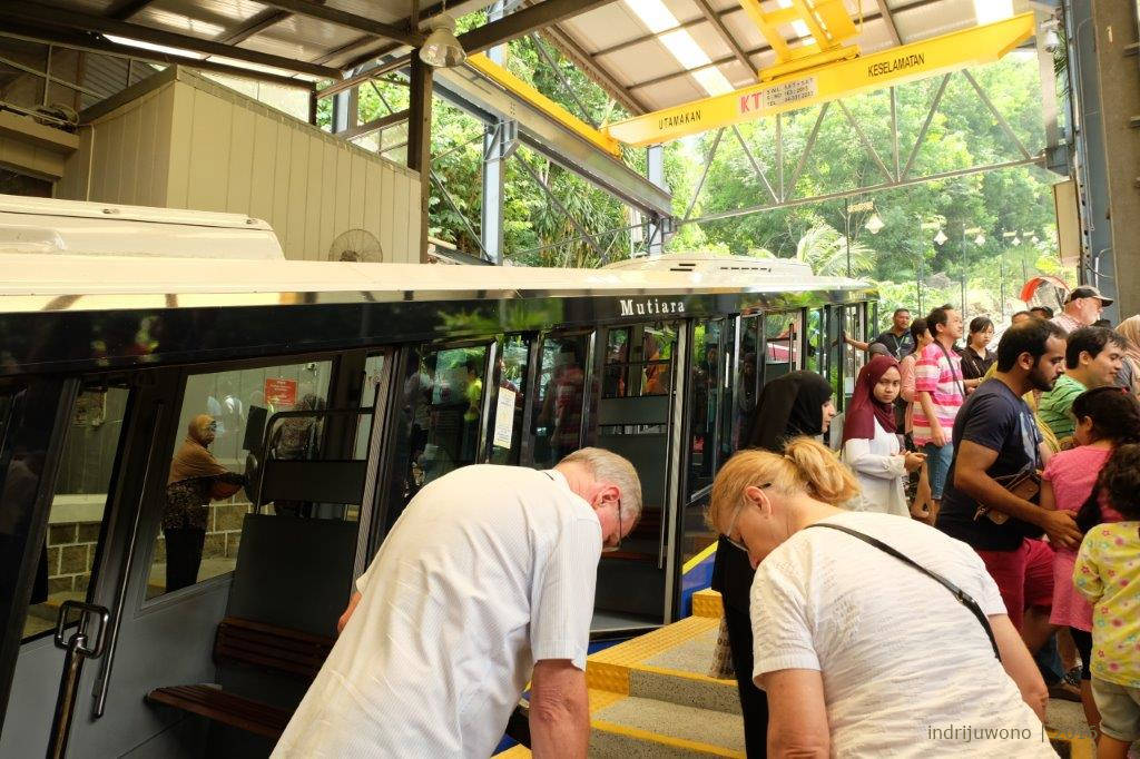 Dengan satu gerbong sekali berangkat, maka cukup ramai dan berdesakan. Padahal kami ke sana bukan hari libur lho. Terdapat platform berundak untuk mengantisipasi penumpang yang naik di kereta yang miring ini. Tentu saja di dalamnya berundak juga, tidak ikut miring.