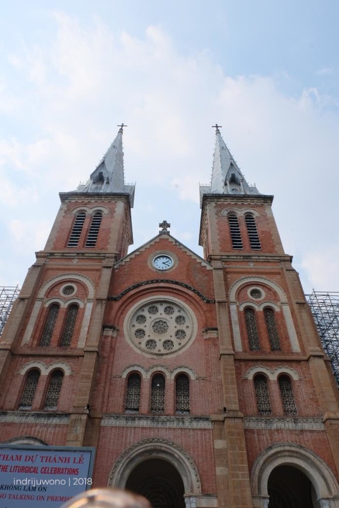 Menyeberangi taman yang hijau, aku tiba di Notre Dame Cathedral of Saigon Nhà thờ Đức Bà Sài Gònyang juga merupakan situs historis yang berdiri di tahun 1880-an. Sayangnya, katedral ini sedang tutup karena sedang direnovasi. Tidak sempat mampir, aku melanjutkan perjalanan ke Kantor Pos karena takut tutup. Karena Vietnam ini negara komunis, maka tidak heran jika warna merah dan bintang hitam mendominasi di mana-mana.