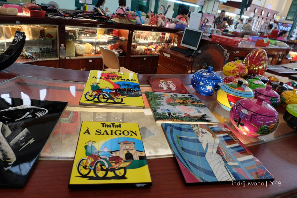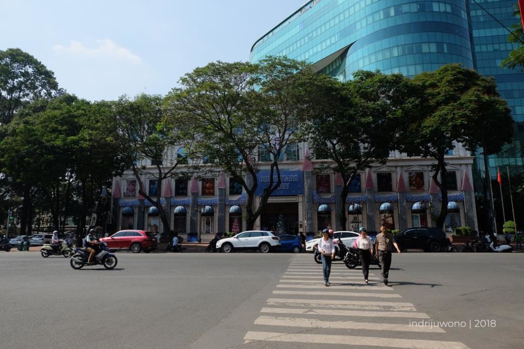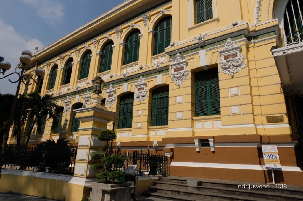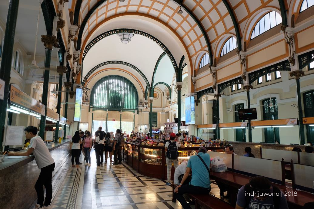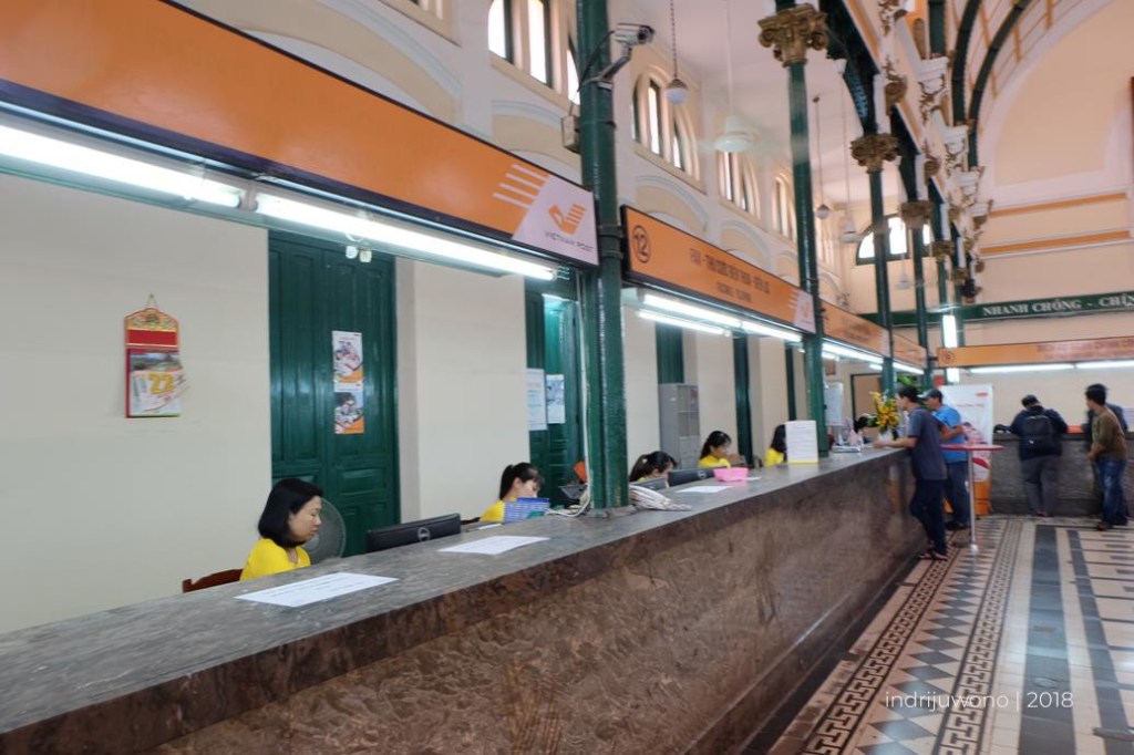 Kantor Pos Bưu điện trung tâm Sài Gòn di HCMC berdiri di tahun 1891 dengan nuansa kolonial yang kental. Seperti tipologi Kantor pos di wilayah Hindia, masuk memasuki hall besar dengan atap beton lengkung dengan posisi loket di kanan kiri yang melayani transaksi pos atau logistik. Tinggi meja batu berlapis marmer itu sekitar 120 cm, pas sedada untuk melayaniku yang sengaja membeli kartu pos dan mengirimkan ke alamat rumah dari sana. Cahaya alami menyinari dari kaca-kaca di dasar atap lengkung. Tidak hanya untuk kantor pos, di bagian tengah pun digunakan sebagai island berjualan souvenir. Pada lapis luar bangunan, banyak juga toko souvenir dengan harga yang cukup affordable, lumayanlah aku bisa membeli snowball di sini.