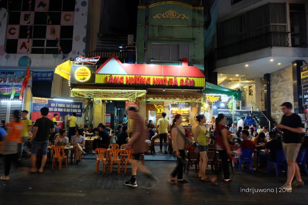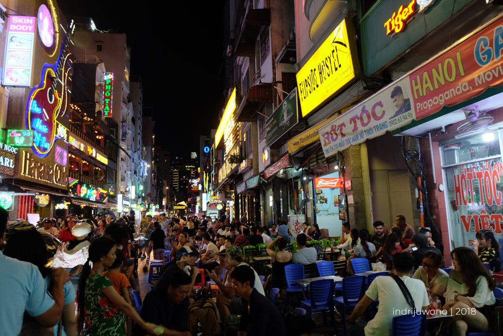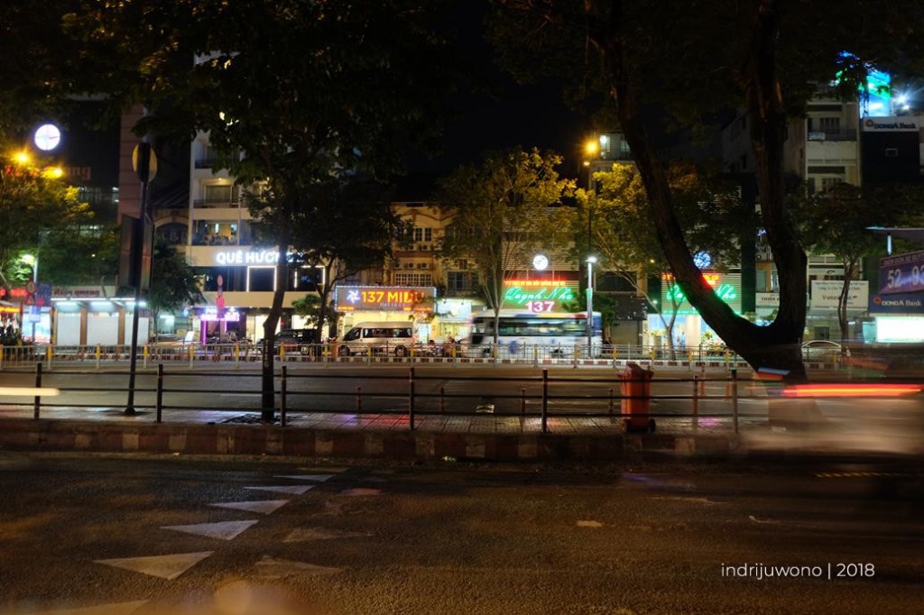 Rasanya nekad memilih waktu tiba di bandara Ho Chi Minh City menjelang tenggelamnya matahari, dan kau sama sekali nggak mengerti bahasa setempat. Berbekal informasi yang dibaca sebelumnya, aku naik bus menuju Bùi Vièn karena memesan bed hostel di sana. Setelah 30 menit naik bis, aku tinggal jalan kaki dan tiba di tempat sesuai Google maps. Aha, tak kusangka tempatnya berupa bar kecil yang kamar hostelnya ada di lantai 3 dan 4, sementara lantai 2 untuk sarapan. Yang lebih mengejutkan lagi, Bui Vien ini adalah jalan yang sangat riuh dengan aktivitas malam harinya karena berjejer bar dengan tempat duduk di tepi jalan. Banyak bule mondar mandir dan menginap di jalan ini juga. Memang itu yang direkomendasikan trip advisor, karena dari jalan ini mudah ke mana-mana.