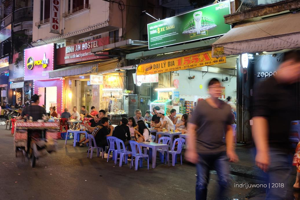 Setelah melepas lelah sejenak, aku keluar dan menikmati keriuhan di Bùi Vièn sambal mencari makan malam. Seporsi capcay dan sebotol bir lokal menemaniku yang makan sendiri di salah satu resto di jalan itu. Sepertinya tempat ini memang menjadi destinasi favorit bule-bule, karena banyak yang berkumpul di sini untuk mendengarkan musik atau minum. Tidak hanya di dalam cafe, di depan pun banyak kursi-kursi plastik yang sengaja dipasang untuk bercengkrama antar sesamanya. Berjalan sendirian di sini pun cukup aman hanya banyak pedagang kaki lima saja di beberapa tempat.