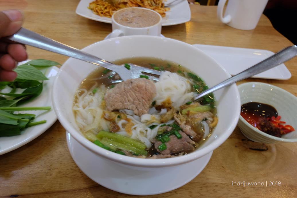 Karena sudah cukup malam, aku kembali ke hostel untuk mandi dan bersih-bersih, dan memang janjian dengan salah seorang warga negara Vietnam yang pernah belajar Bahasa Indonesia di Yogya. Nah, dia menunjukkan lokasi makan Pho yang halal Musa Kareem di dekat Ben Thranh Market. Hmm, setelah berjalan seharian, Pho dengan campuran daun ketumbar ditambah secangkir teh tarik ini rasanya enak sekali.