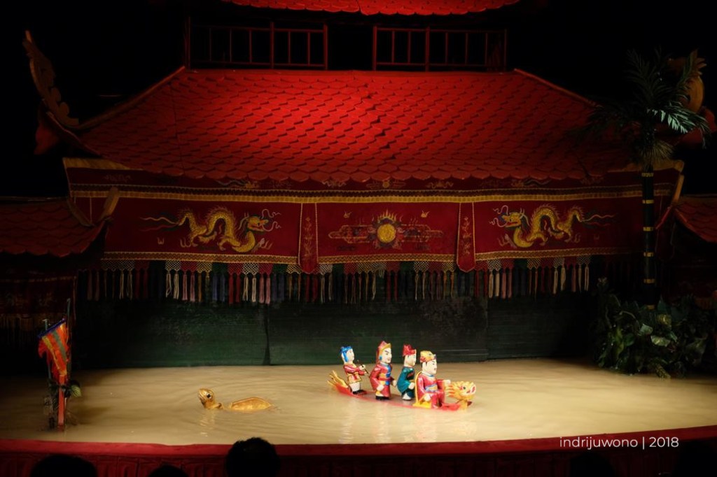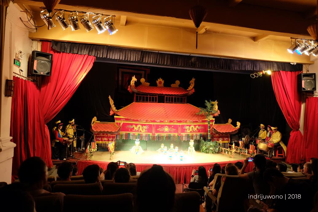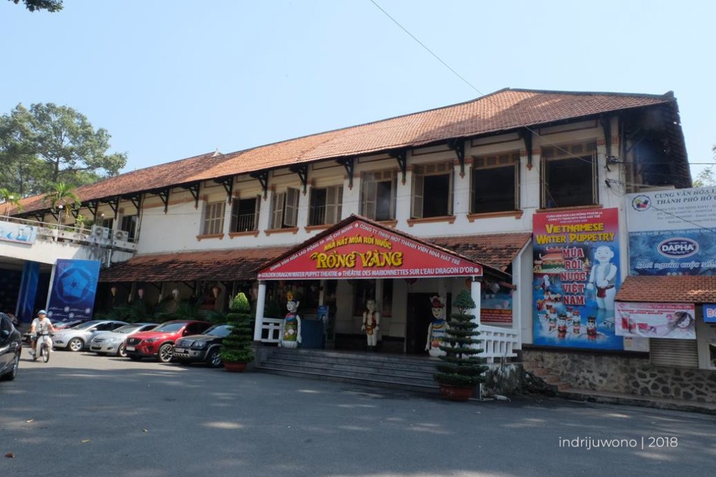 Atas rekomendasi seorang teman, aku menonton water puppet show di Golden Dragon Water PuppetNhà Hát Múa Rối Nước Rồng Vàng yang berlokasi di belakang Independence Palace. Nggak terlalu jauh dan bisa mengistirahatkan kaki yang lelah seharian berjalan ini. Karena ketinggalan show sore, aku menonton yang malam dengan tiket sekitar 200 VND. Dibuka dengan latar belakang bangunan dan air yang menjadi tempat bergeraknya boneka-boneka yang saling menari di atas air dengan ‘dalang’ di balik layar. Di kiri kanannya ada pemusik yang akan mengiringi aksi boneka-boneka ini bercerita. Meskipun disampaikan dalam bahasa Vietnam, namun gerak gerik dan ekspresinya dapat dipahami dengan mudah. Pengunjung yang sebagian besar turis itu pun ikut tertawa jika ada ekspresi lucu, atau ikut bertepuk tangan.
