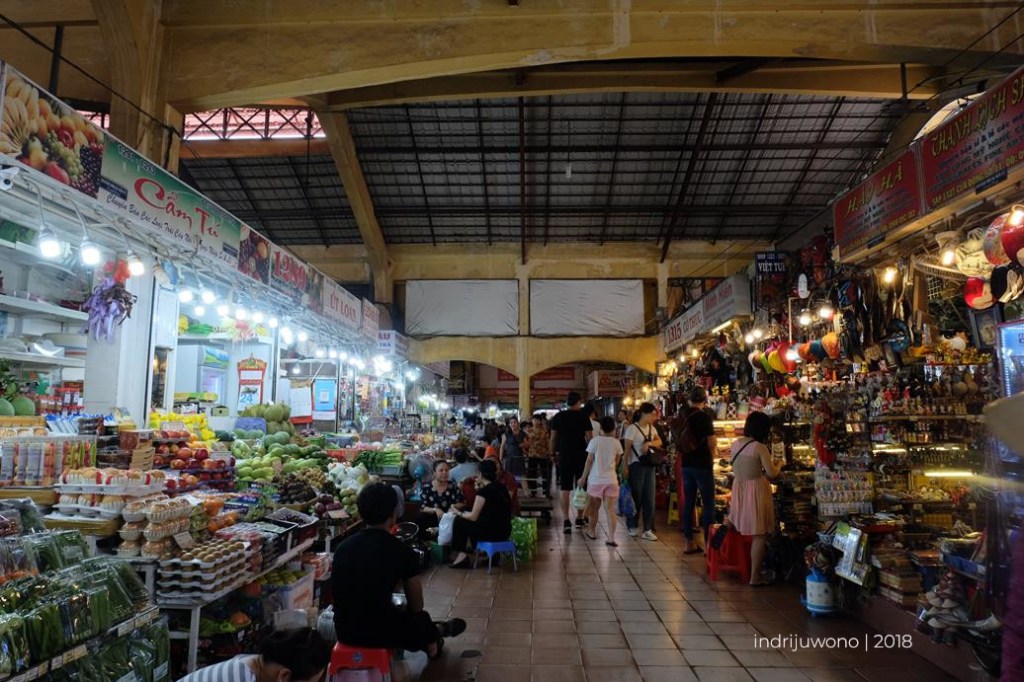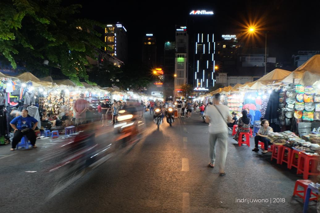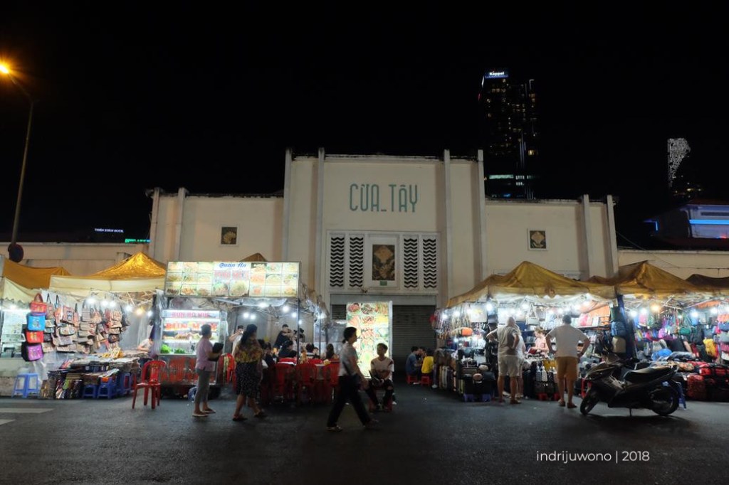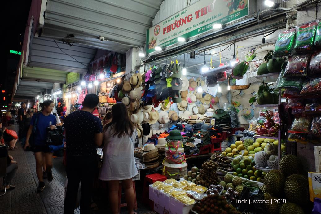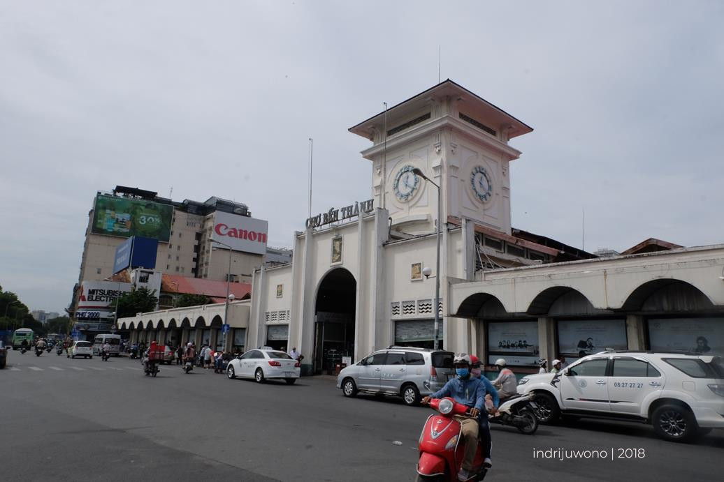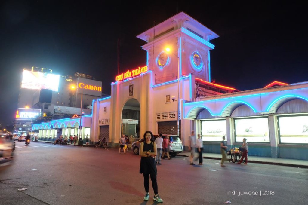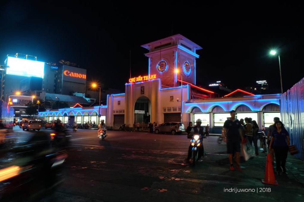 Melintasi Ben Thanh market Chợ Bến Thành bahkan di atas jam 9 malam hari masih banyak kios-kios pedagang yang berjualan bunga, kopi atau souvenir lainnya. Fascia pasar dengan pola lengkung-lengkung, dihiasi lampu menyala biru yang mempertegas bentuk ikonik pasar tersebut, sehingga tetap dikenali di malam hari. Mungkin karena malam hari, jadi aku tidak masuk ke dalam hall ruang pasarnya, tapi tentu siang akan kucoba. Bayangkan, kabarnya pasar ini sudah berdiri sejak abad 17 dan bangunannya mulai dibangun tahun 1911.