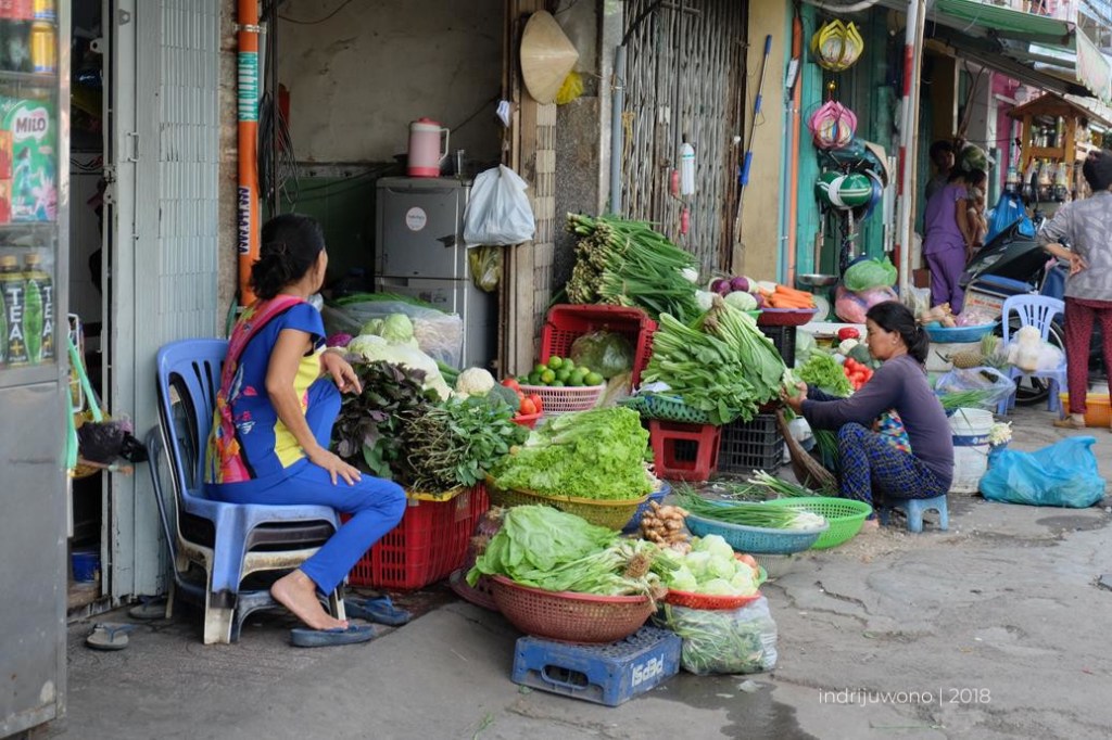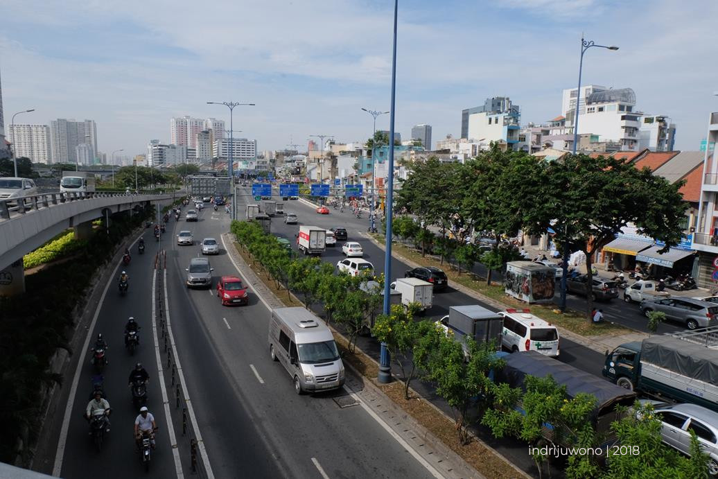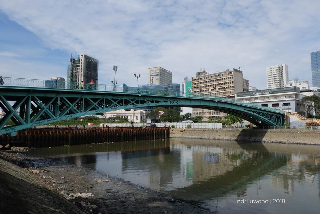 Pagi harinya dari hostel, aku berjalan ke arah selatan hingga sisi sungai Rach Ben Nghe dan melihat bahwa ada sisi-sisi humanis peralihan dari kota lama ke modern, masih adanya pedagang di sepanjang jalan, kendaraan lalu lalang dan mobil-mobil pada antrean di sebelah sungai menuju pusat industri kota.