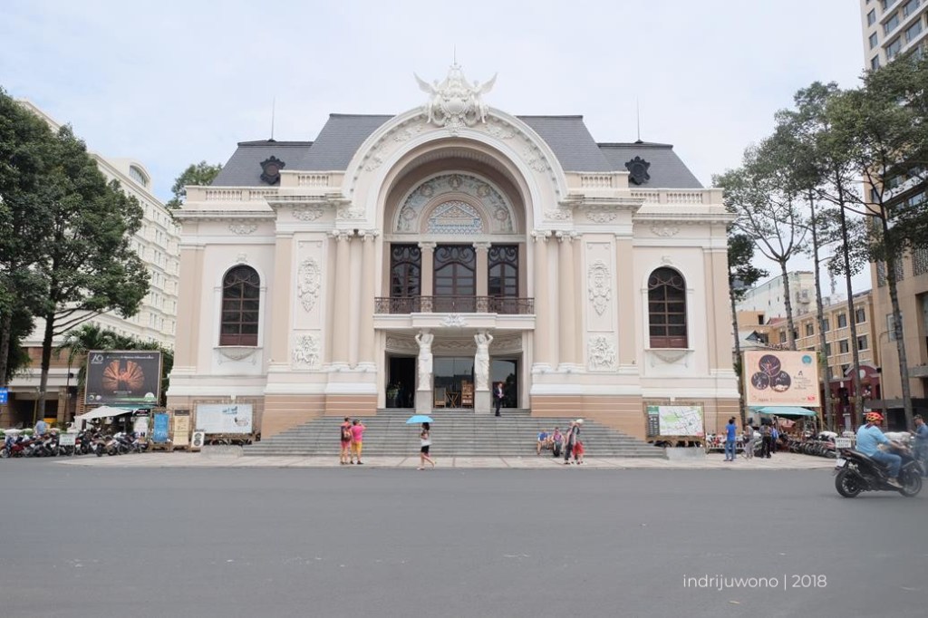 Aku melipir lewat fascia di bawah bangunan untuk mencapai Saigon Opera House Nhà hát Thành phố Hồ Chí Minh dengan arsitektur klasik dan tangga-tangga di depannya. Mengingatkanku pada Gedung Kesenian Jakarta saja. Tapi area ini memang banyak dikelilingi turis bule yang berlalu -lalang di sini.