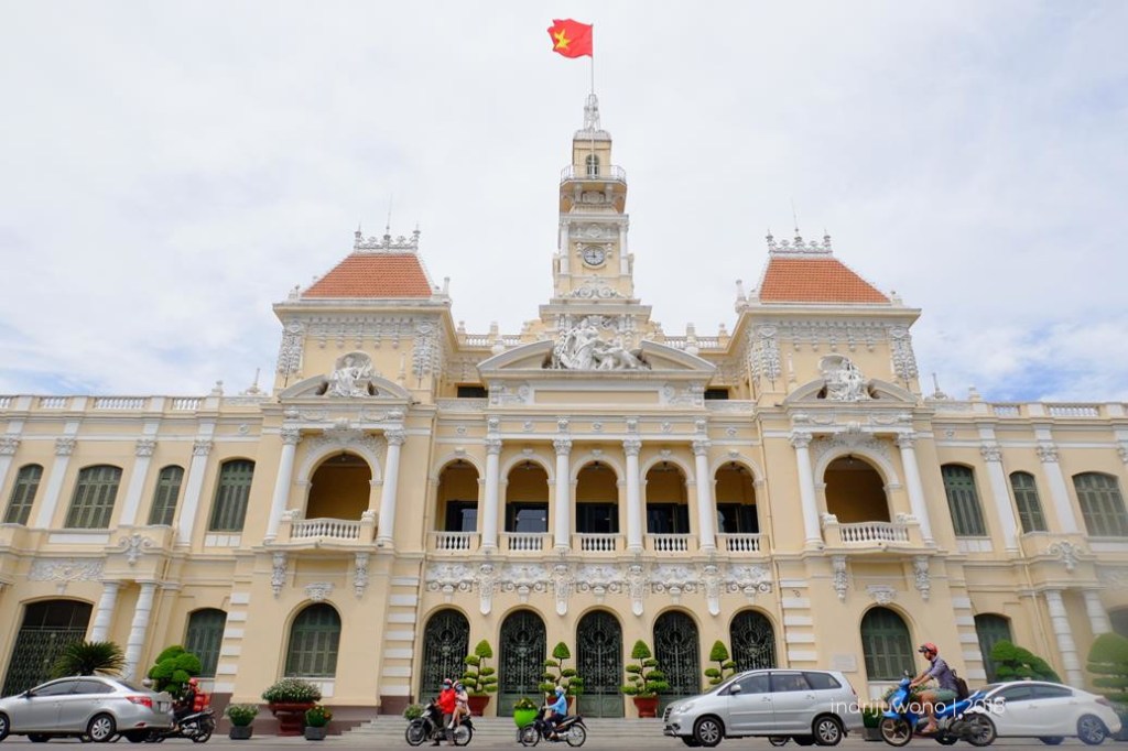 Dan melihat bangunan di siang hari memang rasanya beda, detail arsitektur dari gedung People’s Committee of Hồ Chí Minh City yang digunakan sebagai semacam DPR-nya Vietnam ini terlihat sangat kaya dan detail dengan gaya Renaissance dan Barouque serta Beaux Art. Sayang tidak sempat masuk ke dalam karena sedang tidak dibuka untuk umum. Dirancang oleh arsitek Fernand Gardè, desain bagian ini mengambil inspirasi dari balai kota Paris dan menyerupai menara lonceng di Prancis utara – sebuah menara berbentuk runcing yang menjulang tinggi, diiringi oleh dua menara loteng simetris dengan blok bangunan sampingnya yang lebih rendah namun panjang di sisi-sisinya. Menara tengah mencakup jam dan di puncaknya terdapat tiang bendera.
