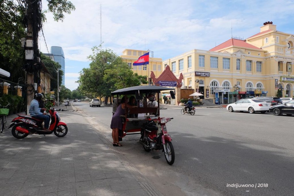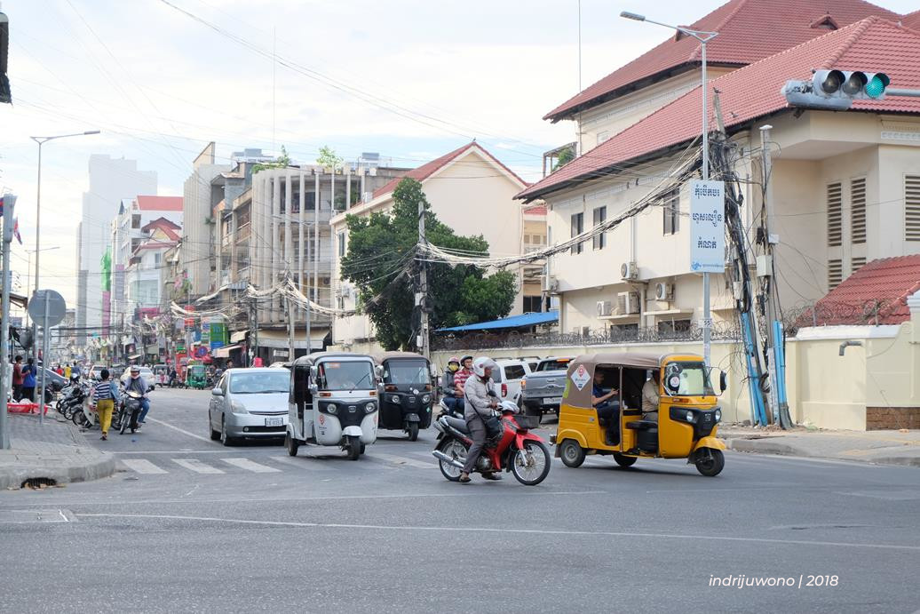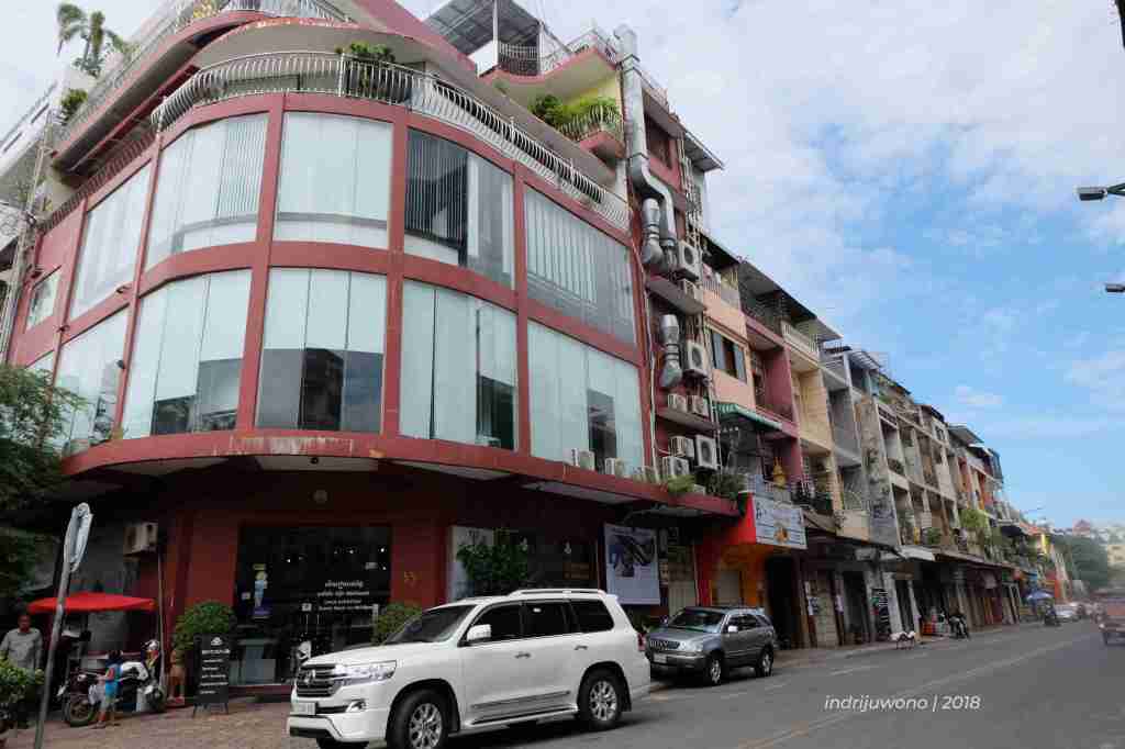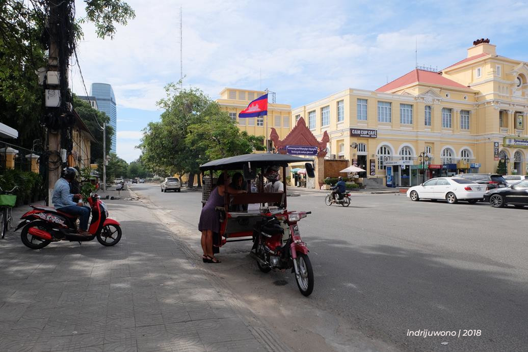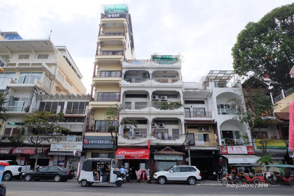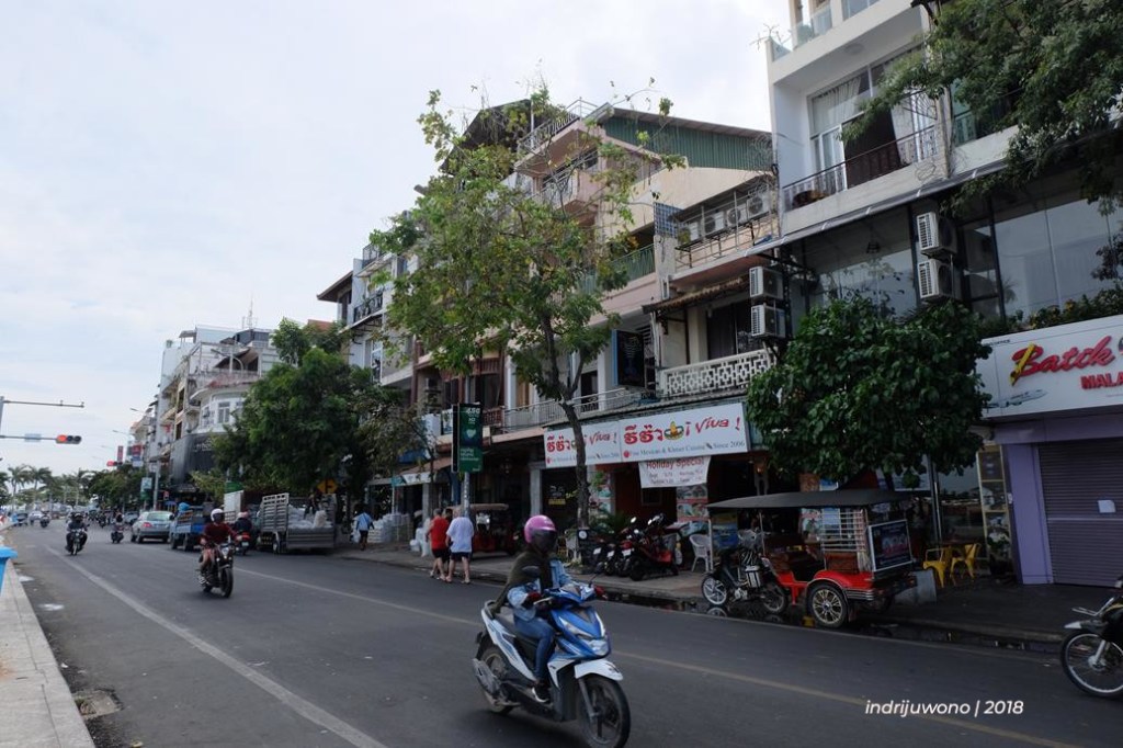 Kota Phnom Penh di siang hari tampak santai, tak seperti ibukota negara pada umumnya. Cuma ada tuktuk, mobil keluaran lama, sepeda motor, dan orang berjalan kaki. TIdak banyak kerumunan, kemacetan atau kesibukan lainnya. Dilihat dari modelnya, bangunan-bangunan ini berdiri di tahun 80-an atau kurang, karena tidak tampak modernisasi di sisi ini. Ruko empat lantai atau lima dengan gaya retro yang sudah berubah menjadi hotel atau dining place.