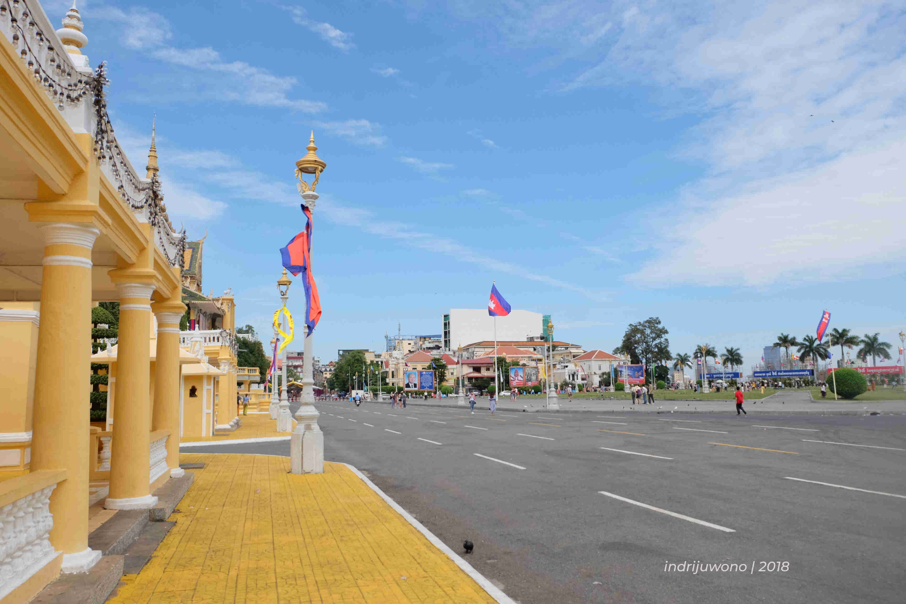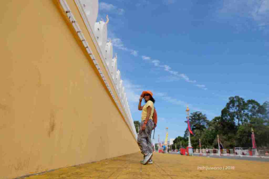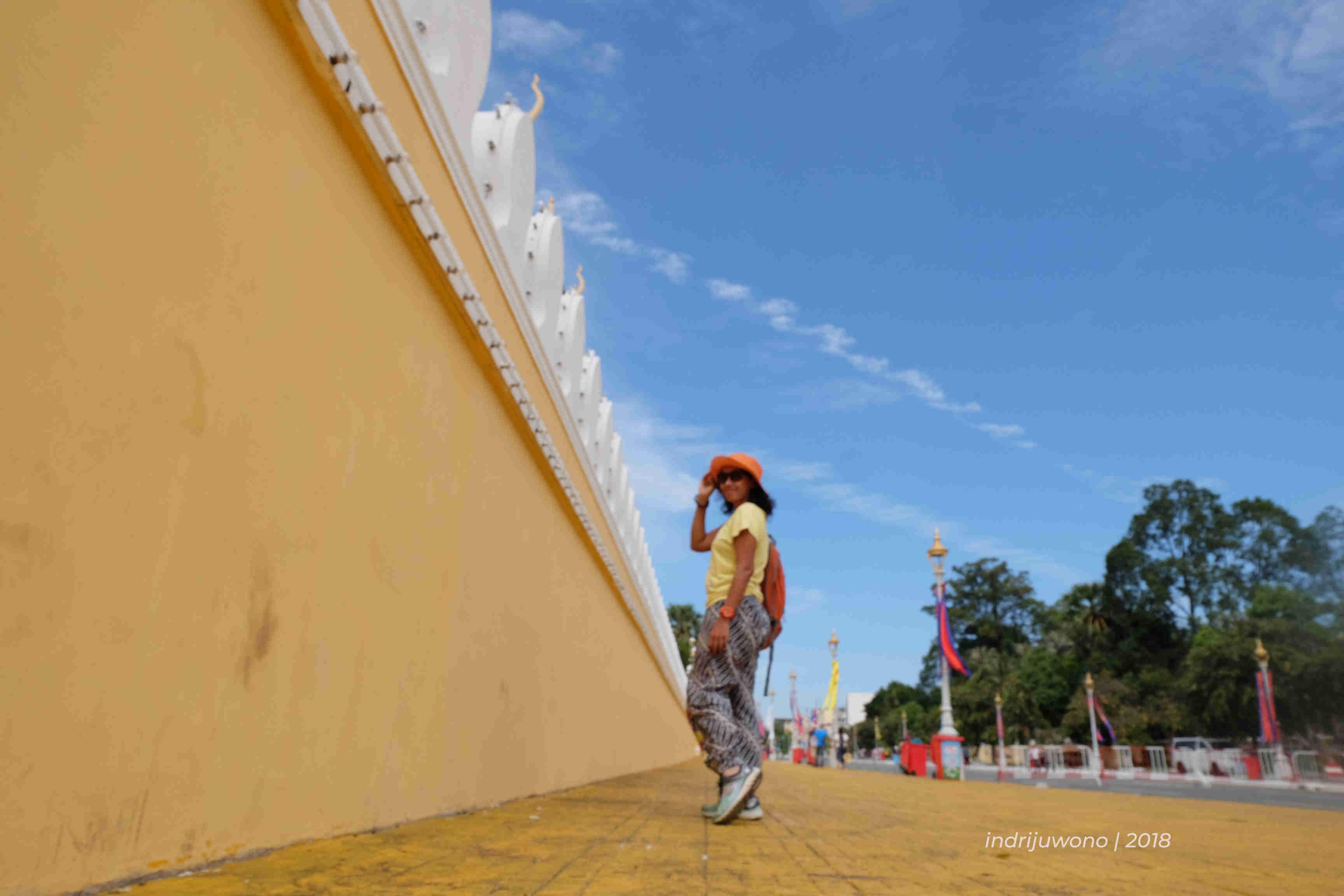 Sengaja mengenakan celana batik, aku memutuskan untuk tidak ke Royal Palace dulu karena sudah tutup gerbangnya, huhuhu. Sambil berjalan ke arah alun-alun, ternyata baju kuningku ini cukup serasi dengan nuansa kuning istana. Sayang banget gak bisa masuk hari itu, karena baru buka lagi nanti jam 14:00.