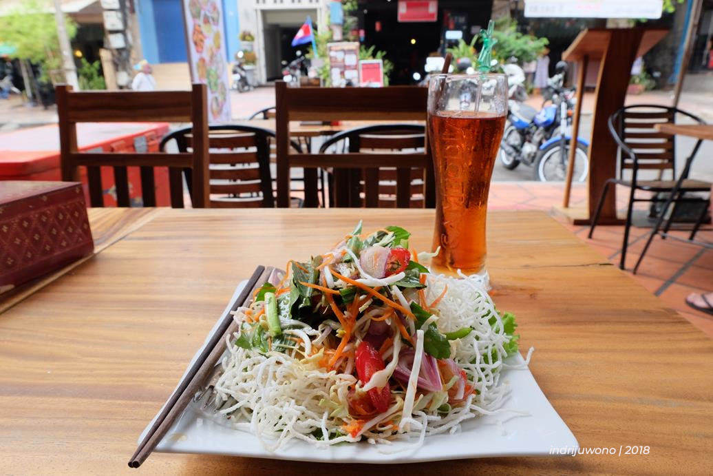 Lepas dari Museum aku mengayunkan langkahku ke arah sungai. Walaupun tidak digunakan untuk transportasi, sungai ini dirawat dengan baik sebagai salah satu wajah kota yang harus dihadapi oleh pemilik toko-toko di sepanjang sungai, sehingga tidak kotor dan bau. Sempat aku mengudap salad sayur dengan bumbu khas Kamboja yang segar, lumayan untuk mengganjal perut di siang hari ini.