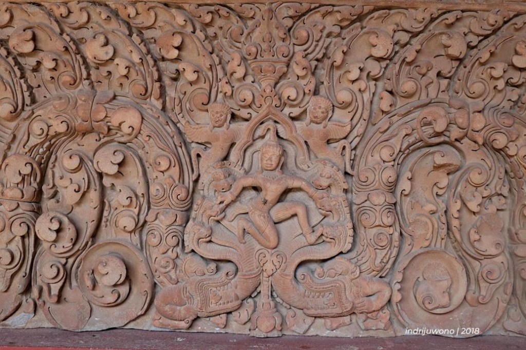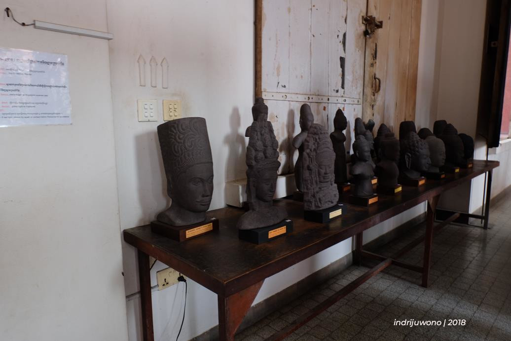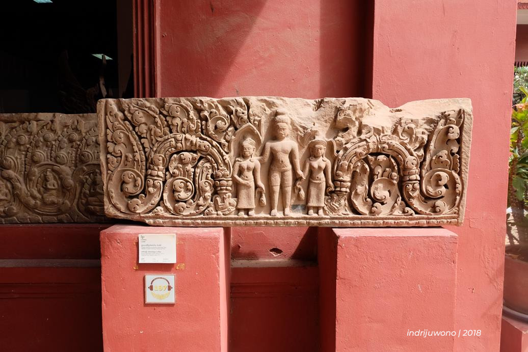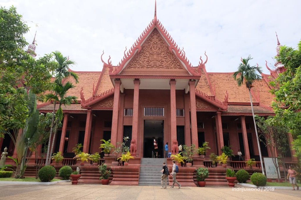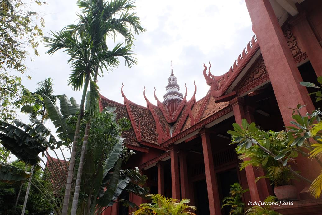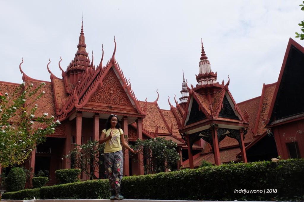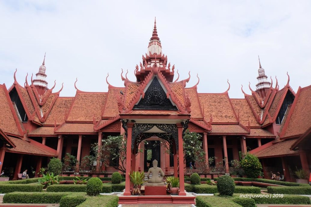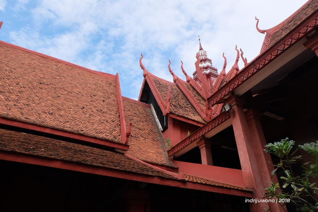 Ternyata di sebelah istana ada National Museum of Cambodia berwarna merah bata yang cerah, berisi sejarah Kamboja. Dasar arsitek, daripada memperhatikan koleksinya, aku malah asyik mengamati detail bangunan. Atap besarnya yang seperti pelana berlapis-lapis, tinggi pada bagian tengah dan sudut-sudut, khas pada arsitektur Khmer dengan tiang-tiang yang besar, adanya menara berbentuk kuncup teratai berlapis-lapis, melambangkan gunung Meru.