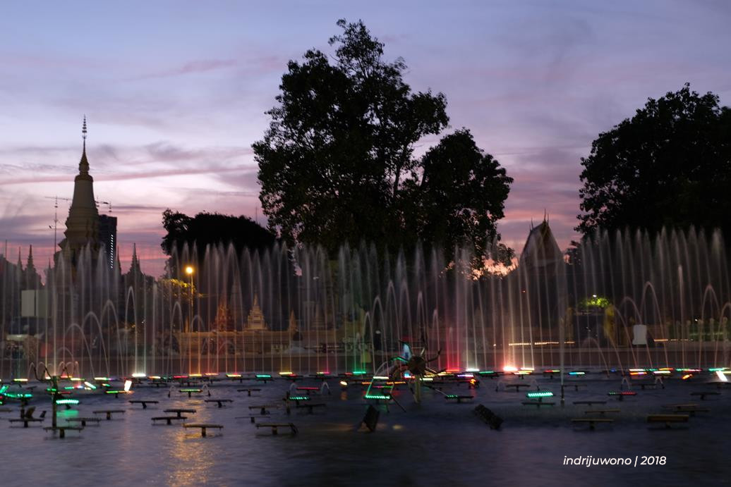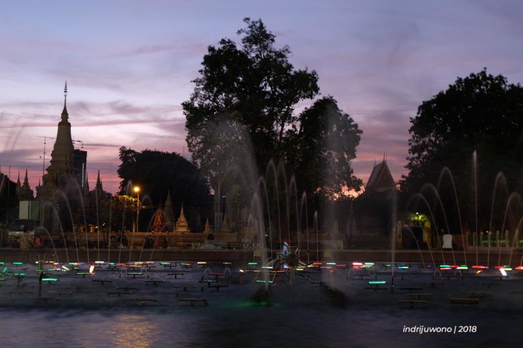 Sebelum makan malam aku mampir ke Wat Botum Park dan melihat air mancur menari hingga matahari tenggelam. Langit lembayung kemerahan ditemani dengan air mancur yang bisa dinikmati dengan gratis ini.