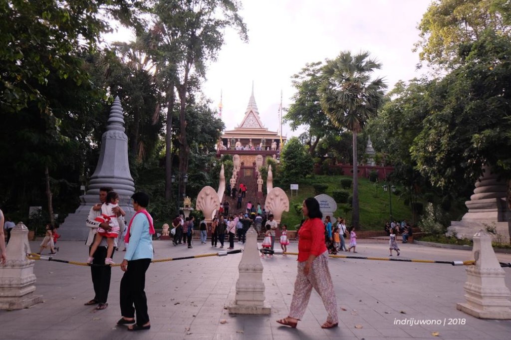 Aku berjalan terus ke utara hingga sampai di kuil Wat Phnom Daun Penh yang menanjak. Konon, pada tahun 1372, seorang janda kaya bernama Daun Penh menemukan pohon koki yang tumbang dan mengapung di sungai dekat rumahnya. Di dalam pohon itu, ia menemukan empat patung Buddha perunggu. Terkagum-kagum dengan penemuan ini, Penh dan tetangganya membangun kuil sementara di sebidang tanah yang lebih tinggi di dekat rumahnya. Penduduk setempat menyebut bukit kecil itu Phnom Penh, atau “Bukit Penh,” untuk menghormatinya.