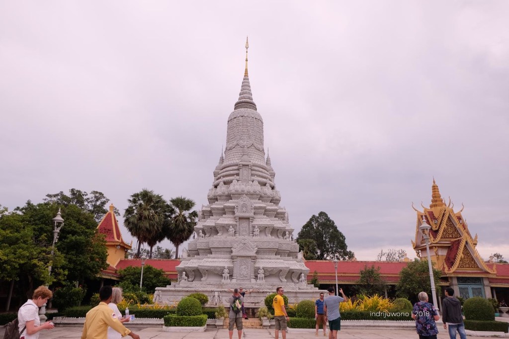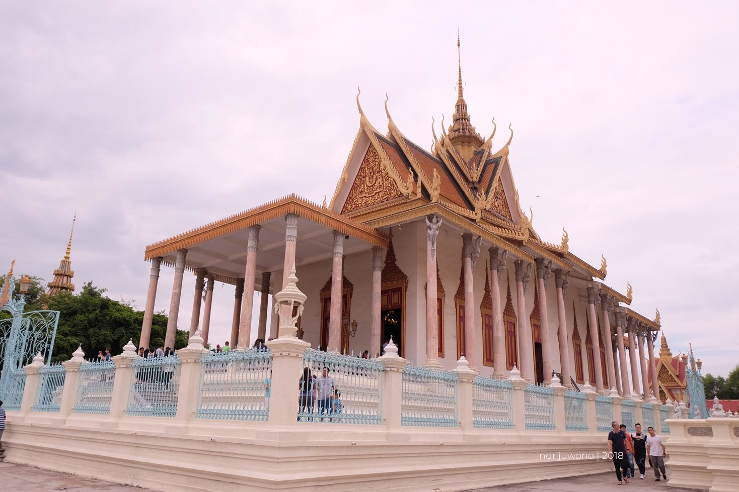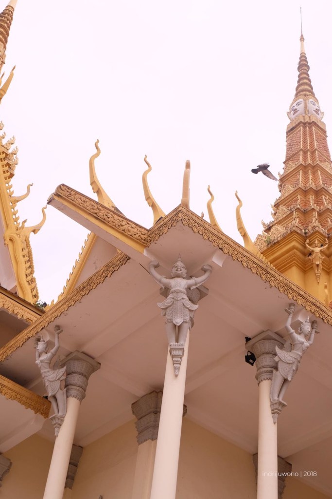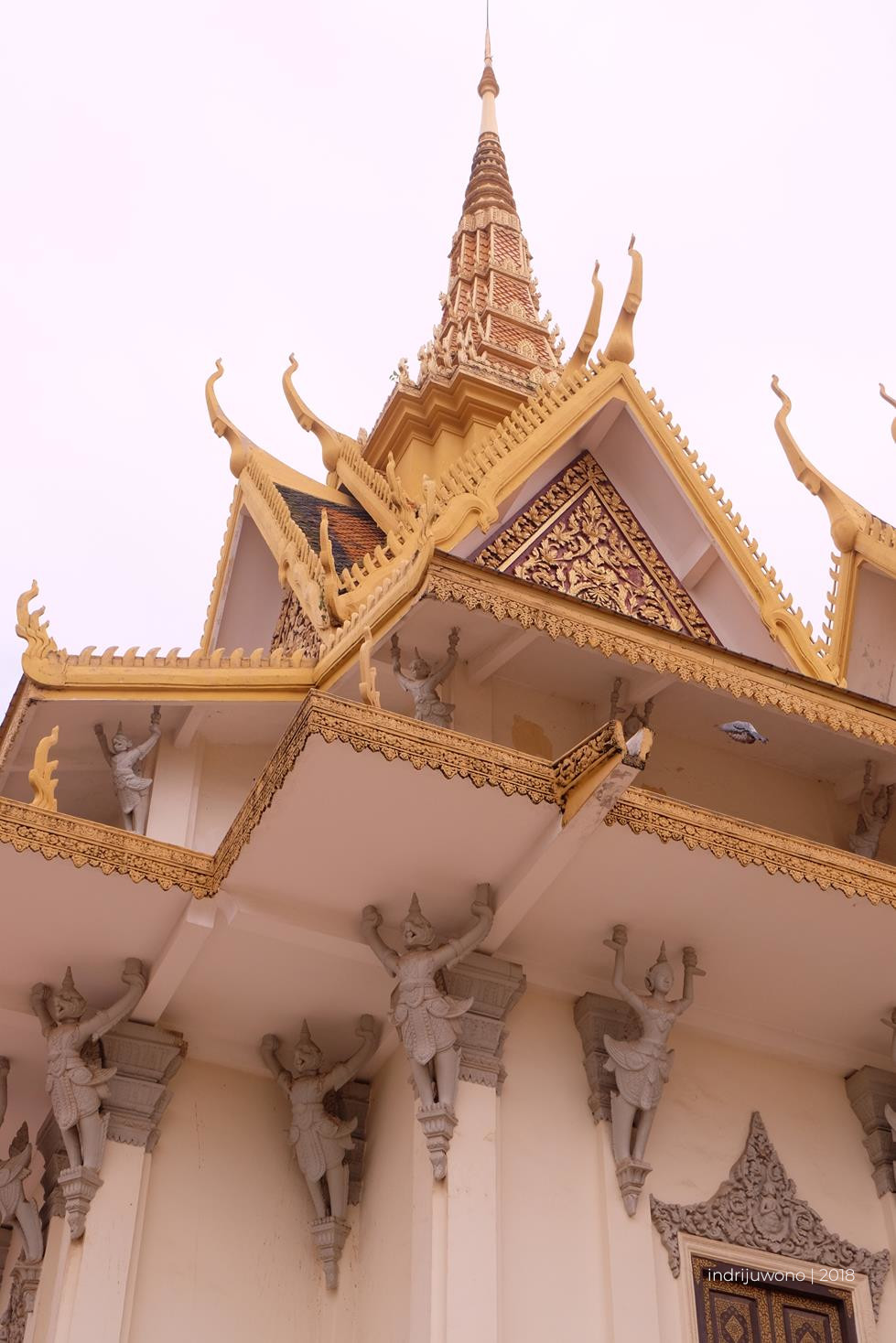 Pada bagian lainnya yang dipisahkan oleh dinding, terdapat Kompleks Pagoda Perak dengan satu bangunan kuil di tengahnya yang berpagar digunakan sebagai tempat untuk beribadah dan menyimpan harta pusaka kerajaan. Bangunan ini dikelilingi oleh sejumlah pagoda berwarna perak dengan hiasan kepingan keramik yang berkilau. Bagian dinding yang mengelilingi area ini ditutupi dengan lukisan kisah epik Reamker (Ramayana). Karena penasaran akan bagaimanakah endingnya, aku mengikuti seluruh dinding sampai tamat. Sama saja ternyata, Sinta masuk ke dalam api. Yang menarik, di sini terdapat juga miniatur Angkor Wat yang merupakan istana lama dari kerajaan Khmer di masa lalu, sebelum didorong untuk berpindah-pindah hingga pada tempatnya di Phnom Penh ini.