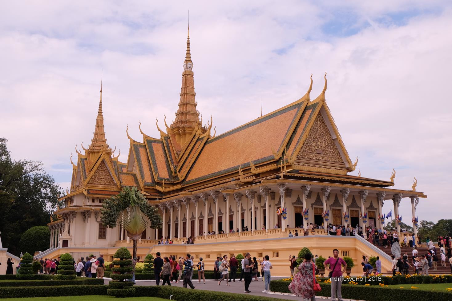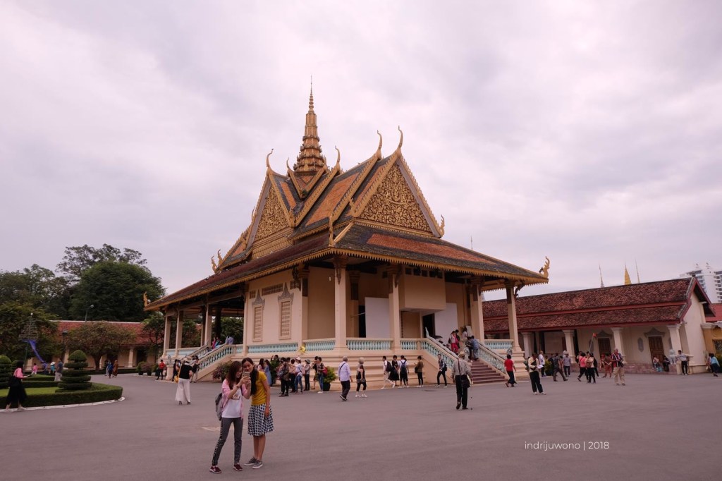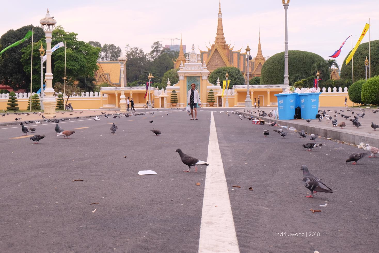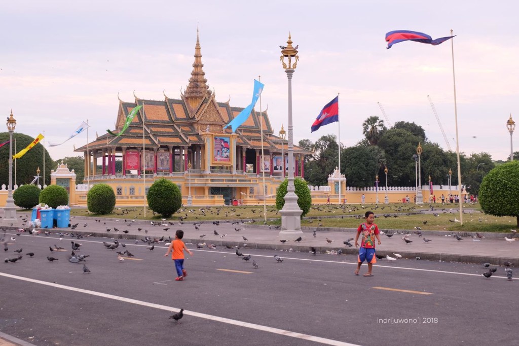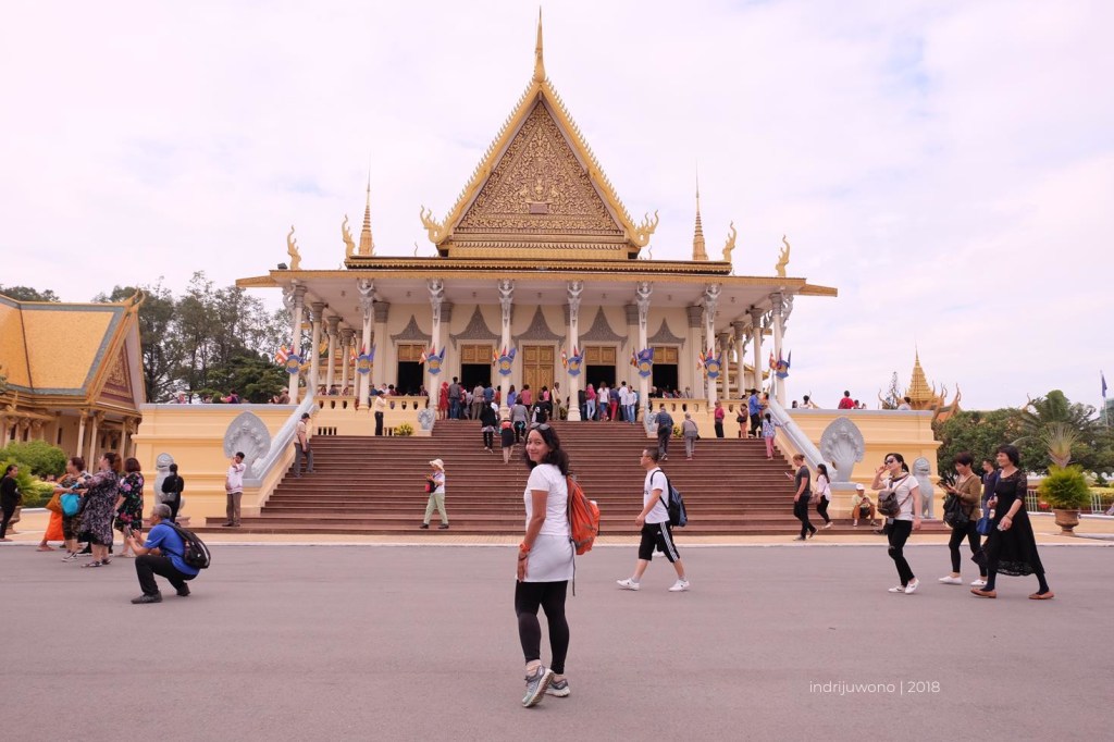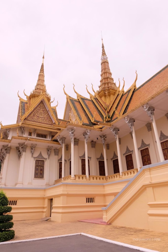 Yah, jadilah aku kembali ke hostel dan memakai t-shirt di atasnya supaya bisa diperkenankan masuk ke dalam istana. Kasihan, nanti rajanya tergoda (ehh..), tapi mungkin memang peraturannya dalam kawasan harus sopan. Setelah membayar tiket masuk seharga $10 (iya, di Cambodia sini masih pakai dual mata uang, termasuk USD), aku melalui lorong hingga tiba di halaman istana yang luas dan asri.