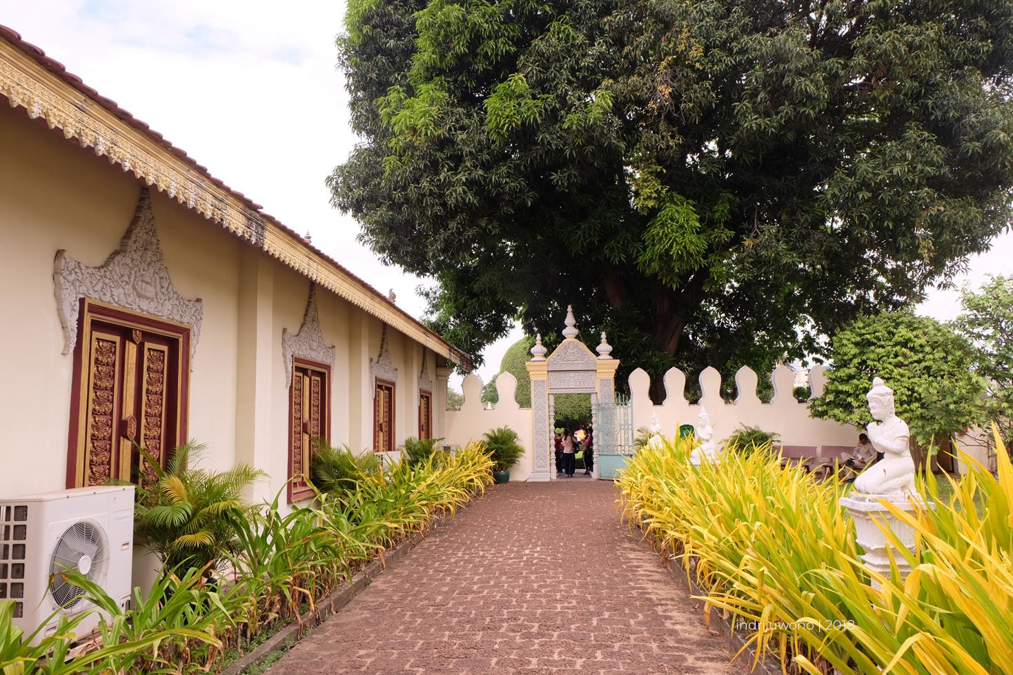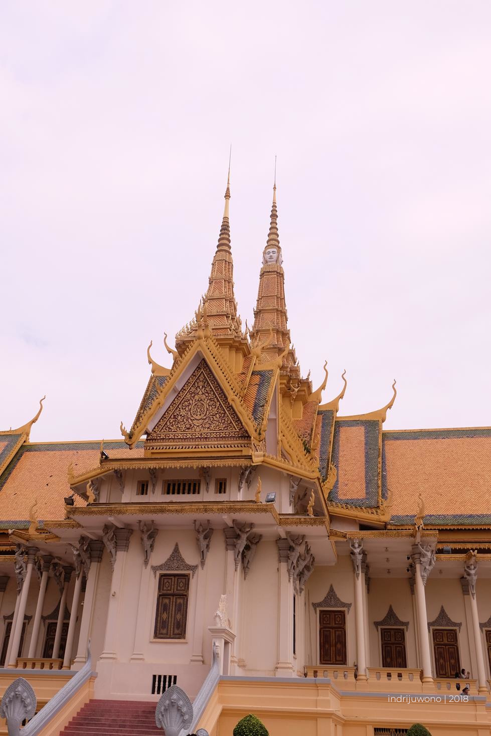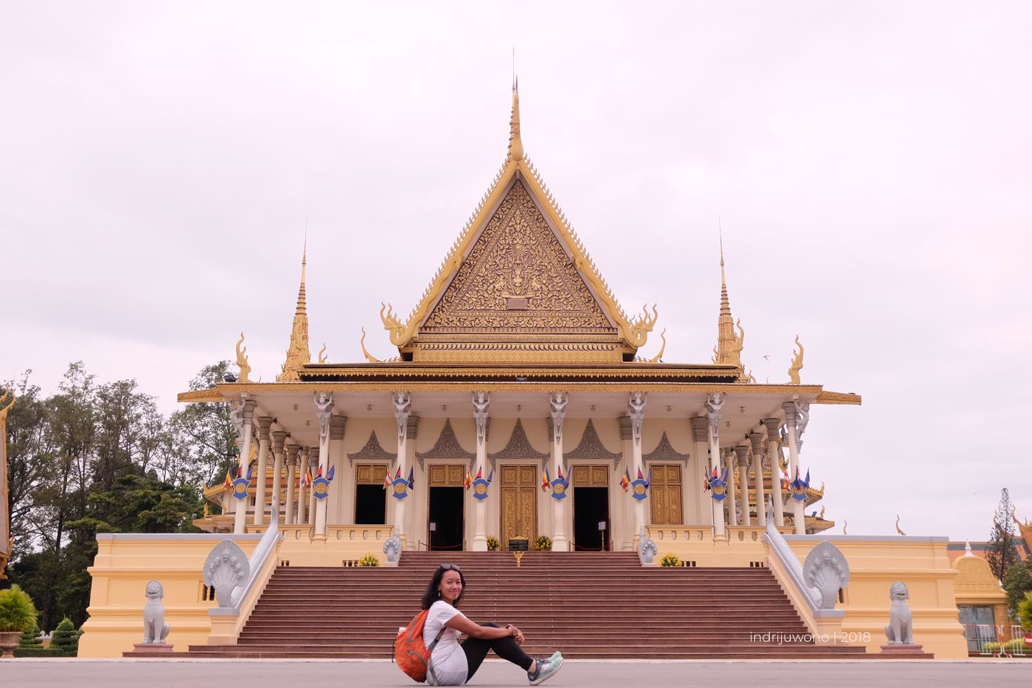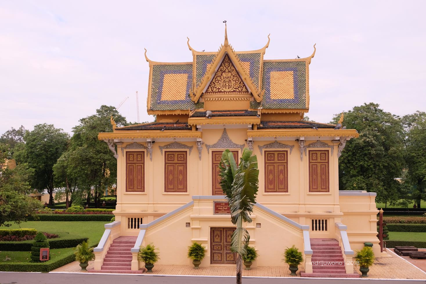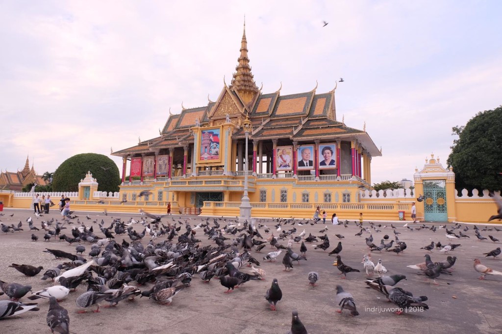 Yah, jadilah aku kembali ke hostel dan memakai t-shirt di atasnya supaya bisa diperkenankan masuk ke dalam istana. Kasihan, nanti rajanya tergoda (ehh..), tapi mungkin memang peraturannya dalam kawasan harus sopan. Setelah membayar tiket masuk seharga $10 (iya, di Cambodia sini masih pakai dual mata uang, termasuk USD), aku melalui lorong hingga tiba di halaman istana yang luas dan asri.