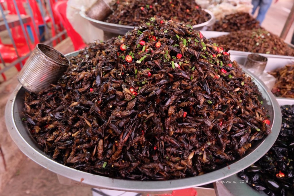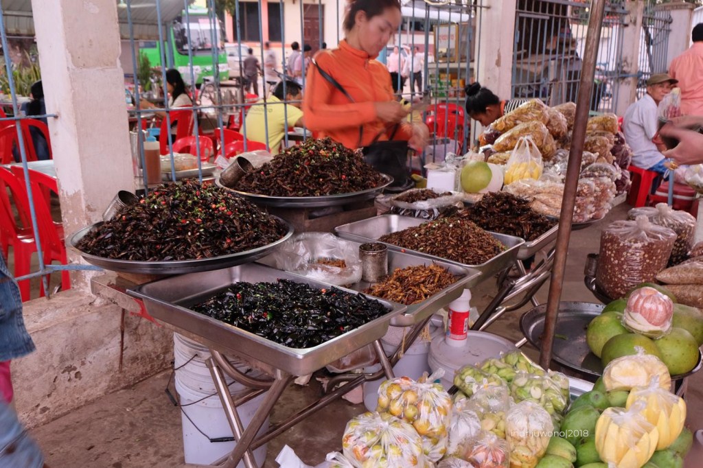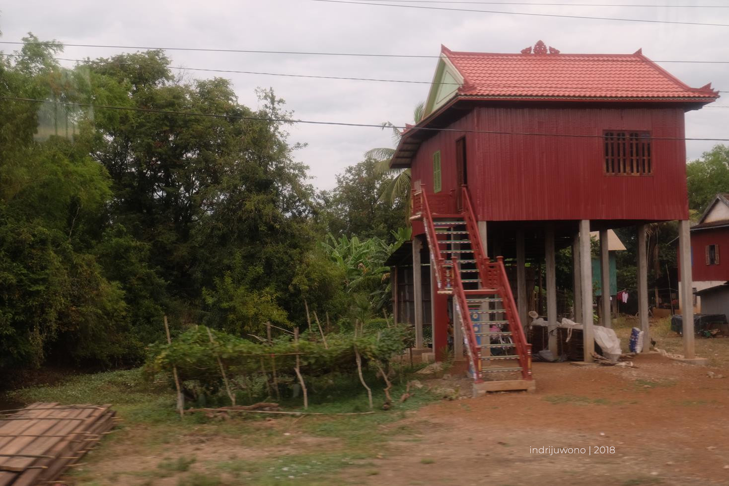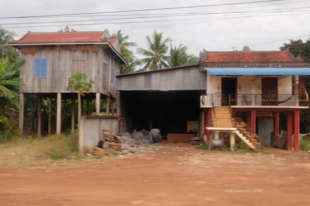 Untungnya mobilnya Toyota HiAce baru cukup nyaman untuk melalui perjalanan yang melalui desa-desa dengan rumah khas Kampuchea. Setelah tiga jam perjalanan, supir beristirahat makan sementara aku melihat-lihat sekitar dan wow, ada yang berjualan serangga goreng! Ya, tapi aku sih nggak berminat beli (seketika teringat acara fear factor). Karena mengantuk, aku gak sadar sudah sampai Siem Reap, dan naik tuktuk sampai ke hostel.