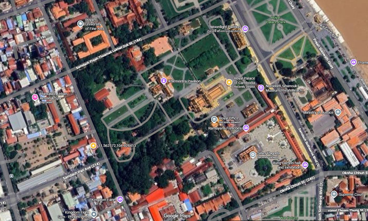 Area Royal Palace ini terbagi menjadi area bangunan di bagian tengah, yaitu Balairung Singgasana, yang masih bisa diakses luarnya, tempat di mana pejabat kepercayaan raja, jenderal dan pejabat kerajaan langsung melakukan tugasnya, dan Istana Dalam tempat tinggal keluarga kerajaan. Pada bagian utara adalah Istana Khemarin yang merupakan tempat tinggal kerajaan juga, dan ke bagian selatan terdapat Pagoda Perak.